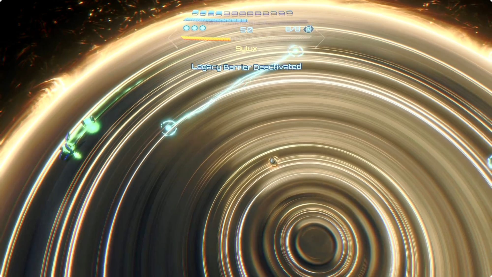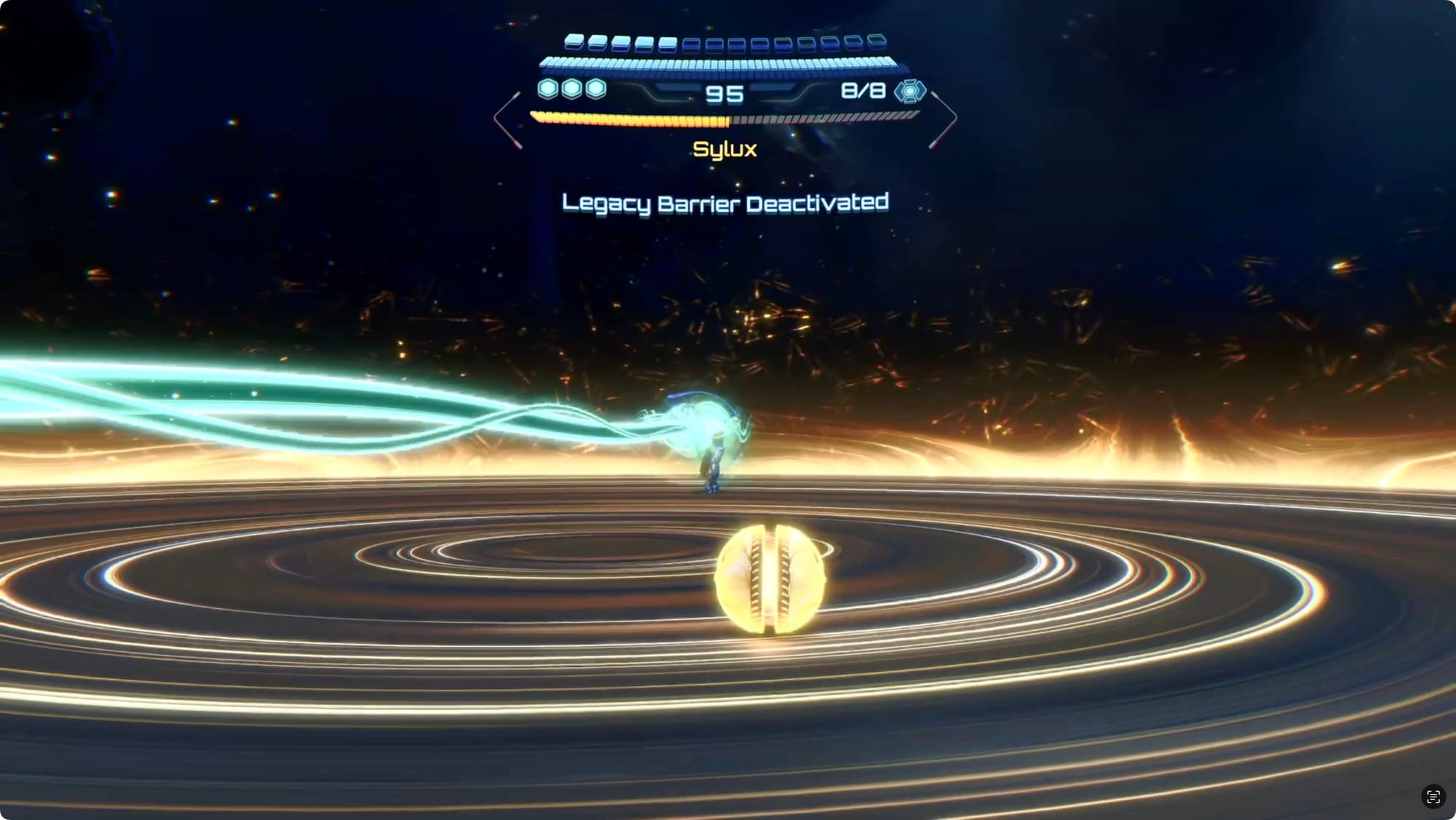 After a bit, he’ll vanish into a wormhole, and then reappear while charging up these black hole-like attacks. When you see him start, fire a Control Beam. You’ll have to steer it down the whole time to avoid it getting sucked into the black hole. Hit Sylux to cancel out the attack.
