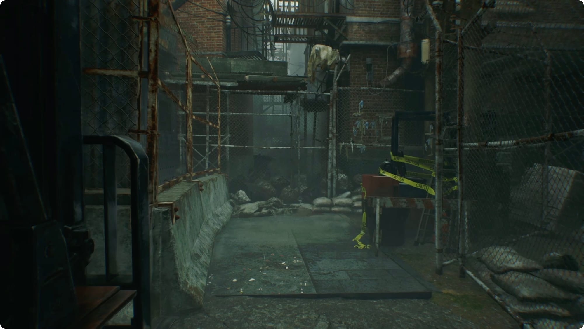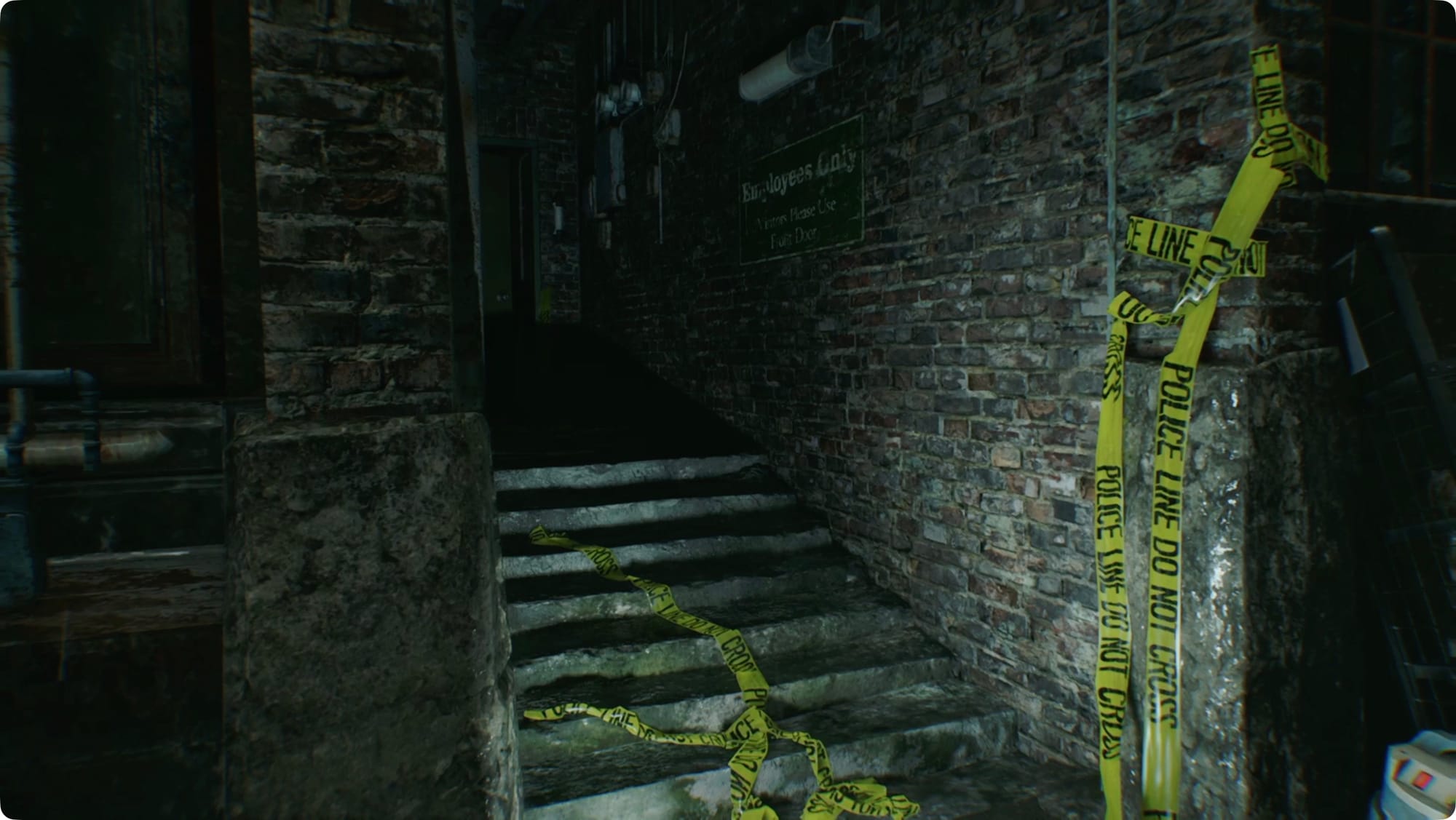 A bit past there, you’ll come to the crime scene that is the hotel. After another cutscene, you’ll head inside. Take a right at the forklift and keep following the alley.