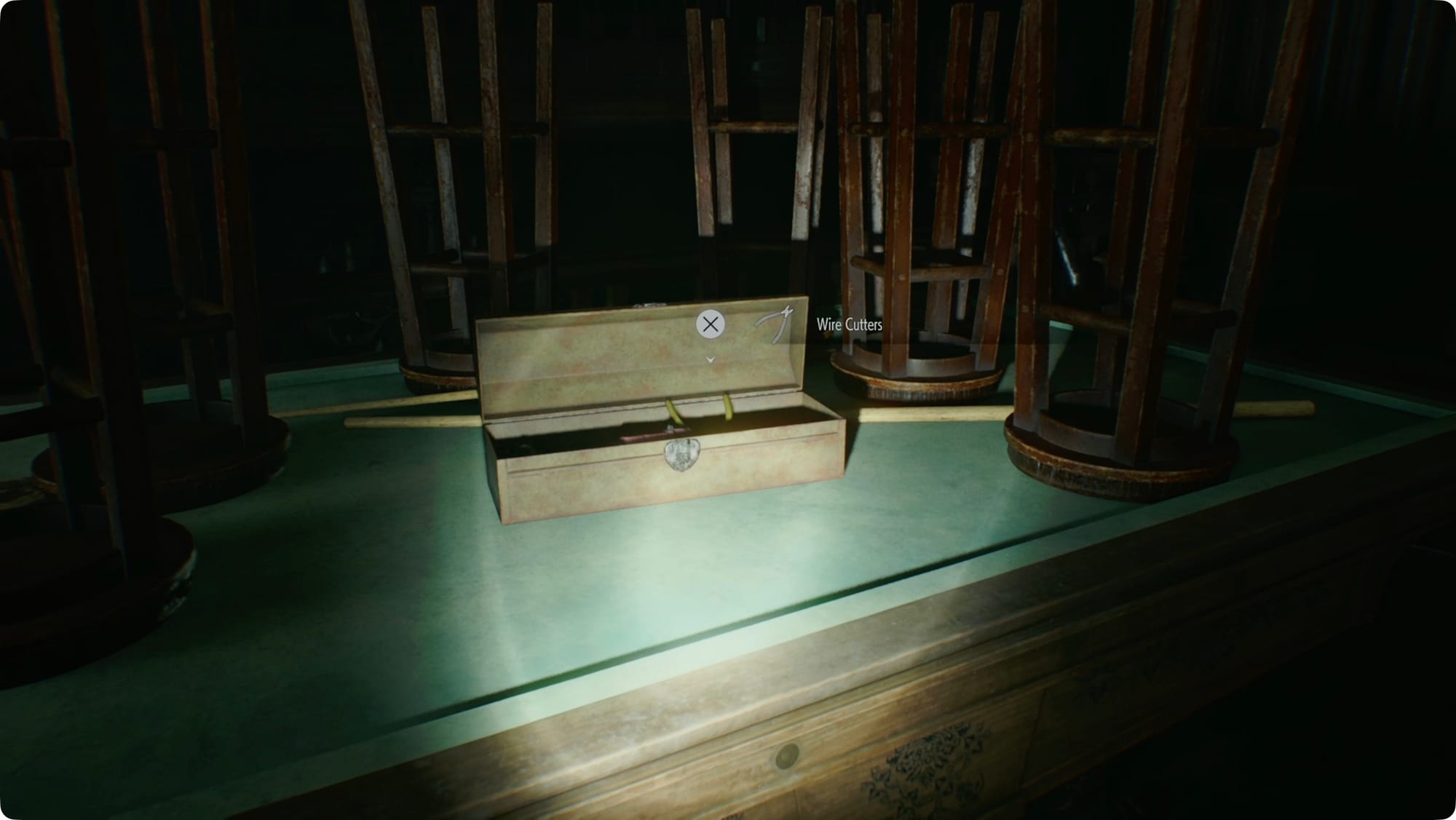 The Emergency Exit here is locked (which is a fire code violation, I’m pretty sure). Look to your left and grab the Wire Cutters from the box on the pool table.
