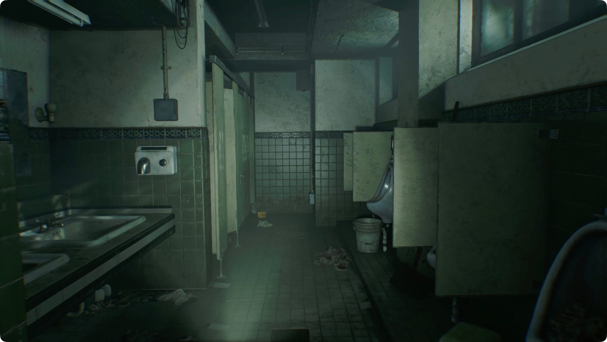 Past the bar, the door on your left is locked. Follow the Lounge around to the right and into the Restroom. There’s nothing in the locker, so take the left and head into the third stall.