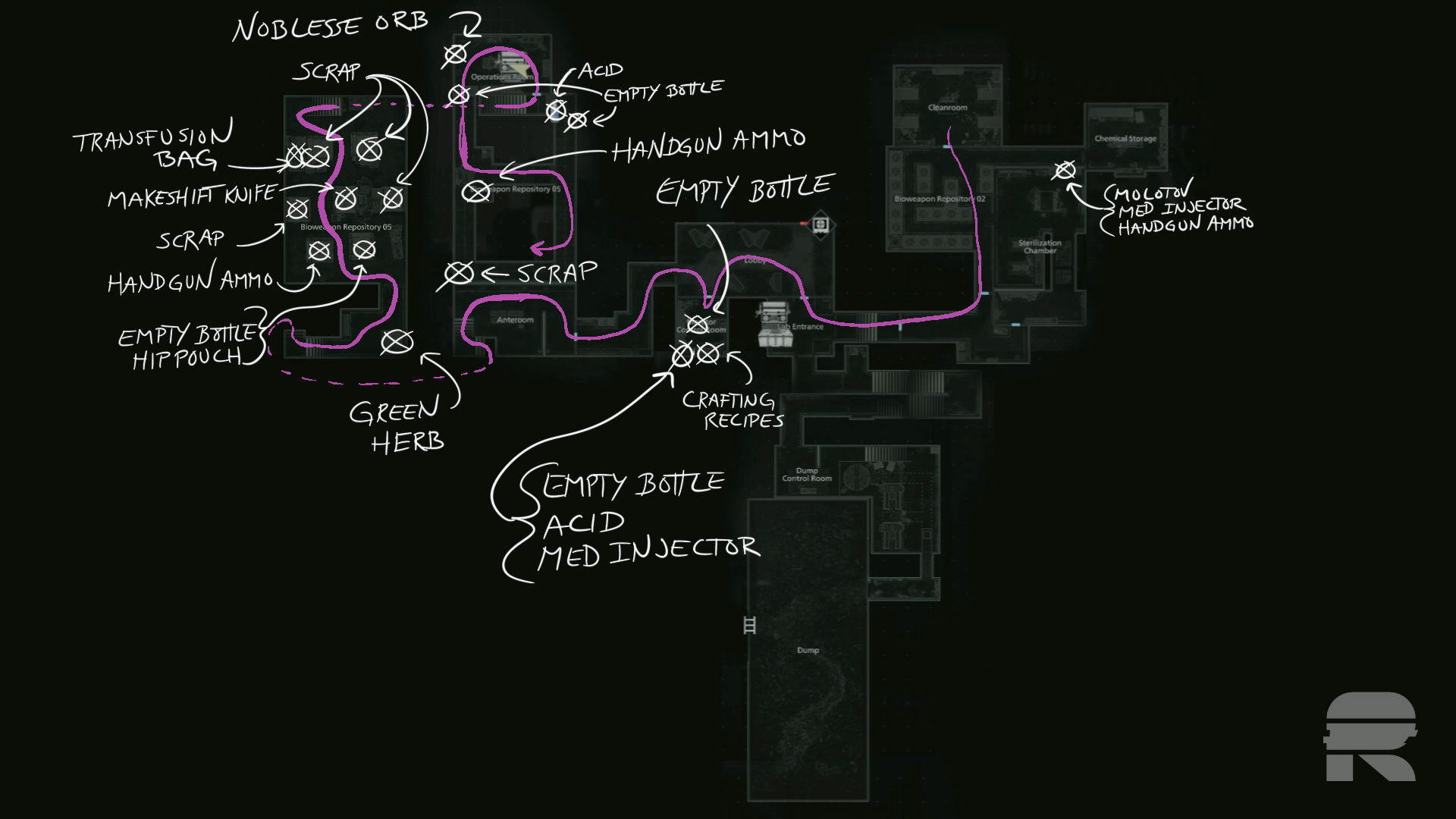 In the last two containers in the Bioweapon Repository 05 before the stairs, there’s some Scrap on the left and an Empty Bottle and a Transfusion Bag (along with a zombie) on the left.