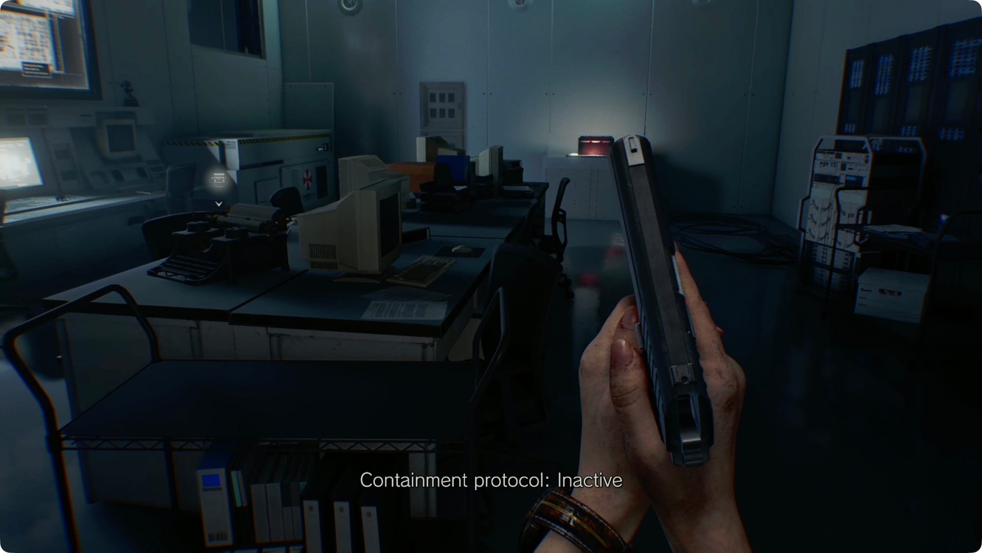 Check the wall monitors for the Product Catalog 2 (2026), Product Catalog 1 (2026), and the Raccoon City Bioweapon Research - Report. Smash the crates for two boxes of Handgun Ammo.