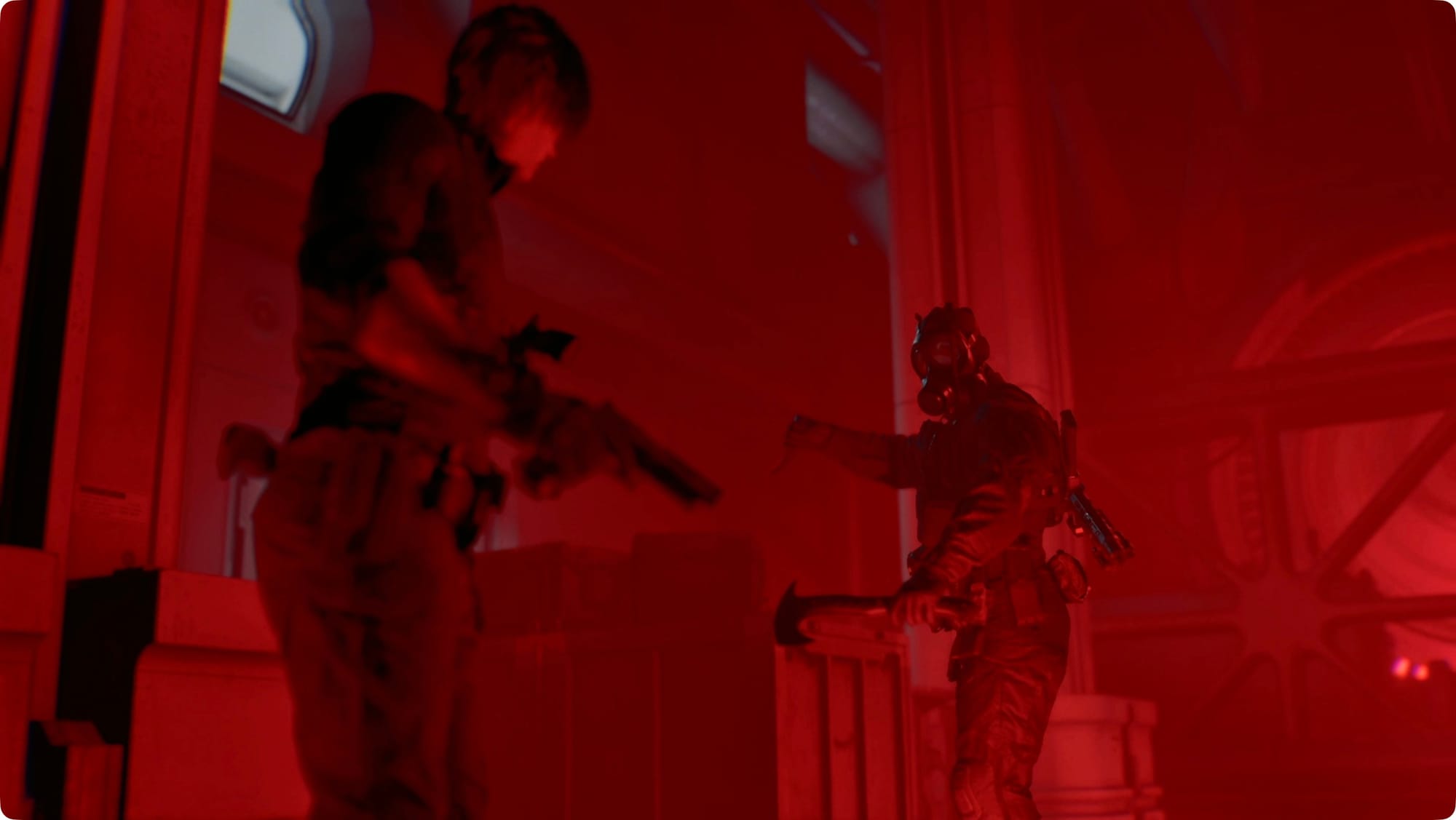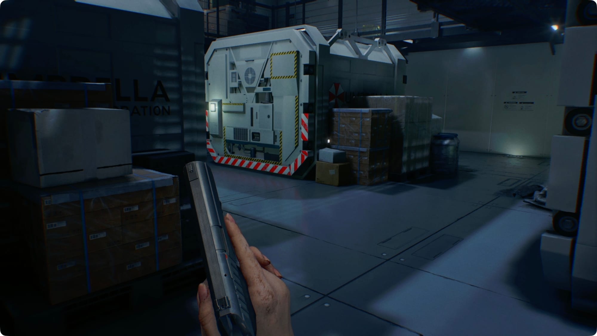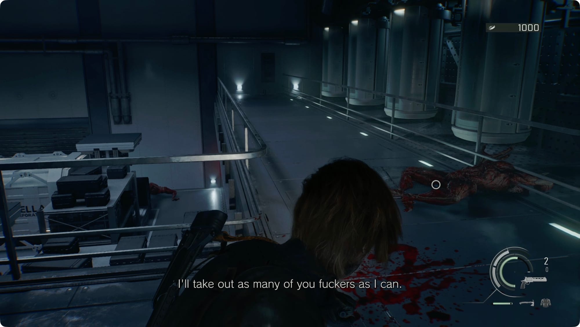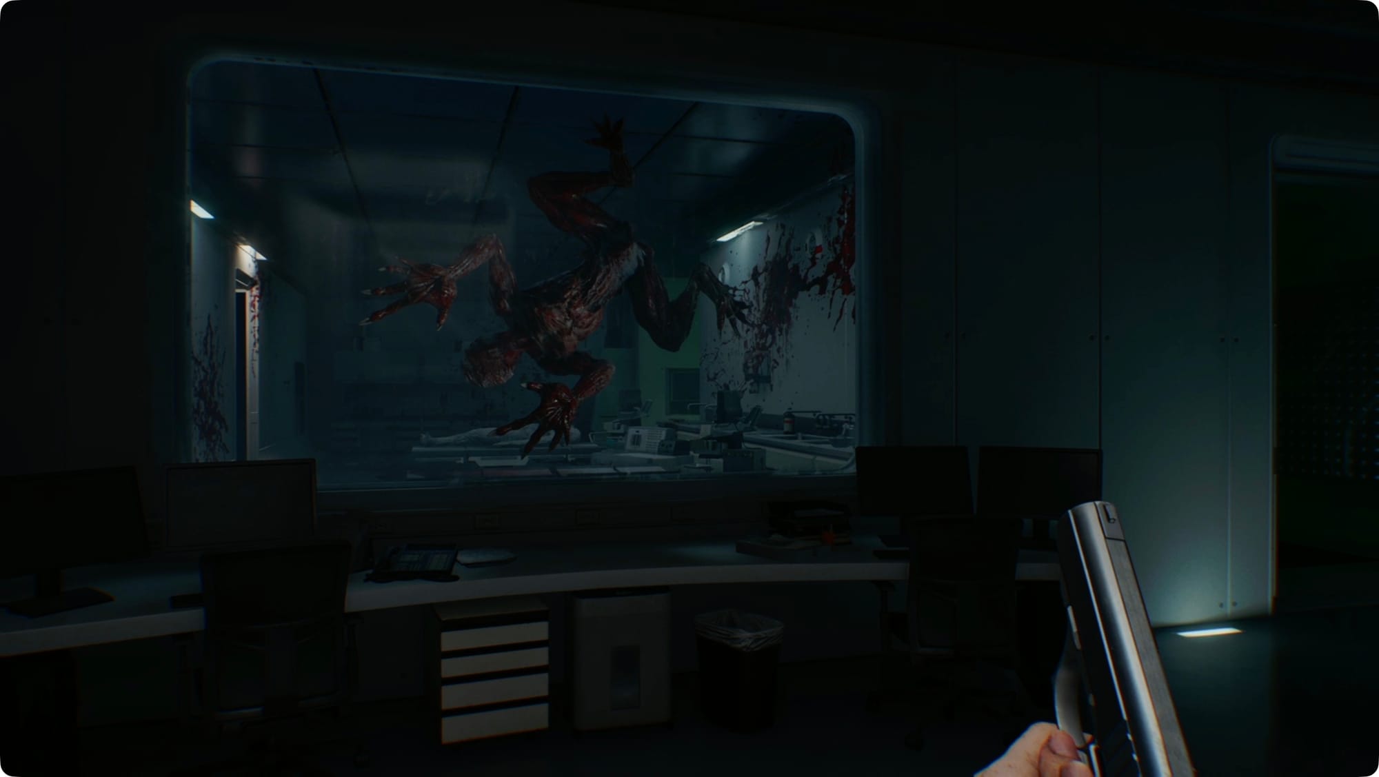 Smash the crate in the middle of the room for some Handgun Ammo and the one by the door out for a Med Injector.