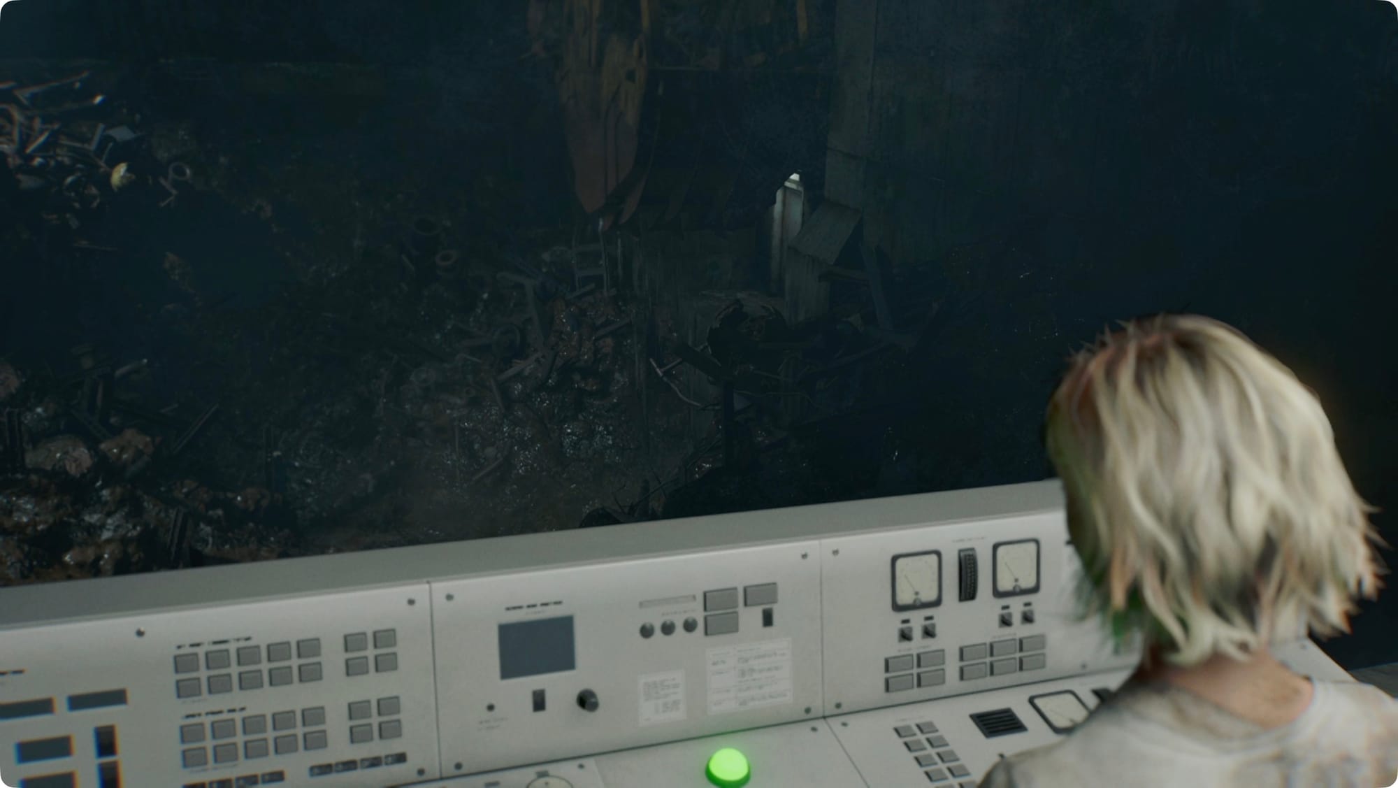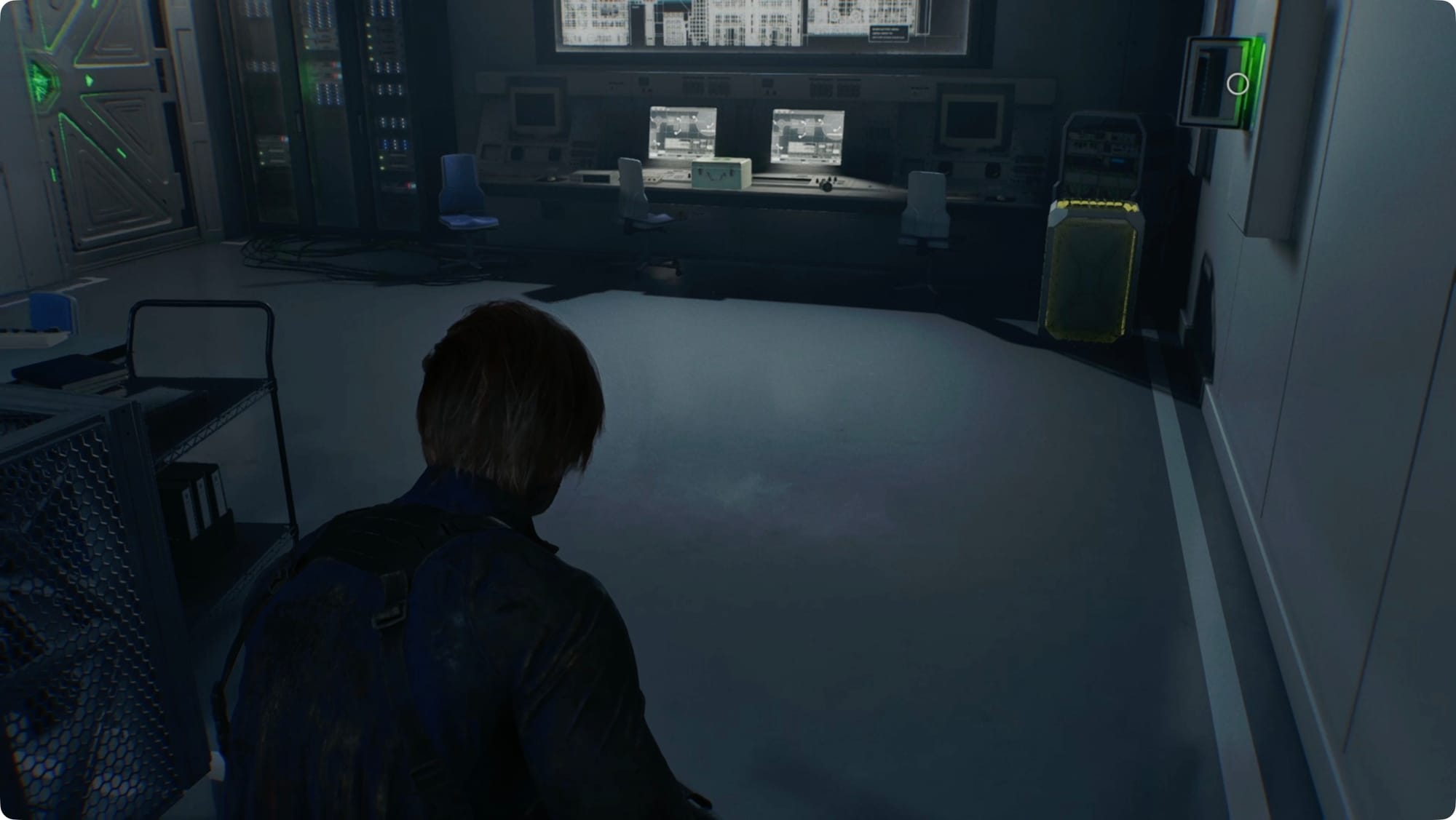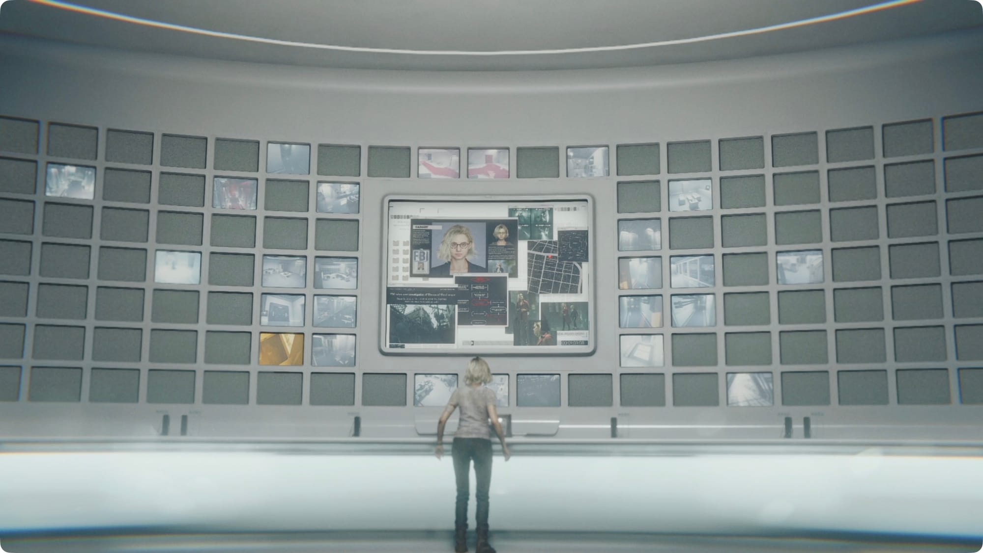 Walk up to the giant wall of screens and interact with the terminal. For a cutscene.