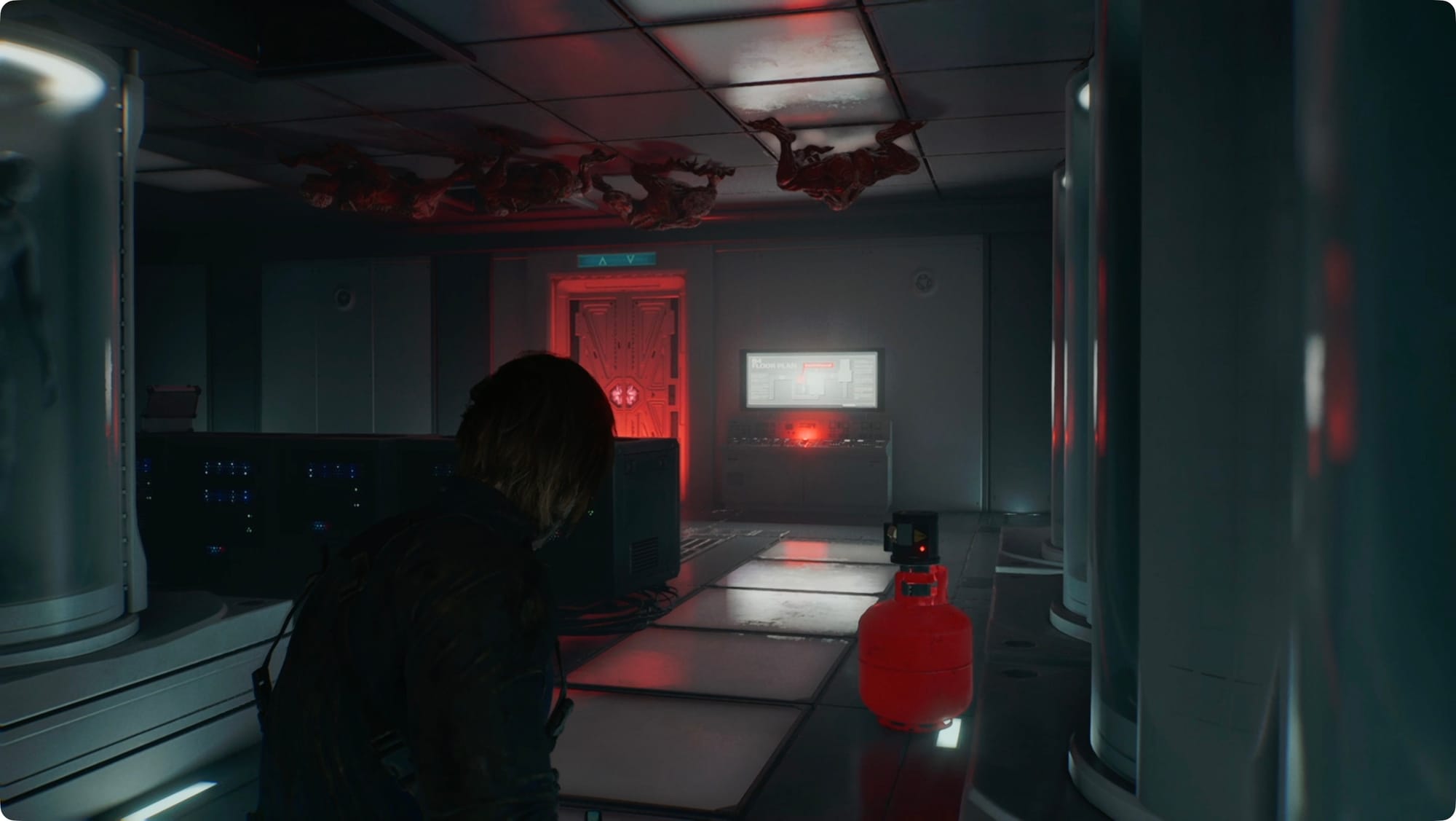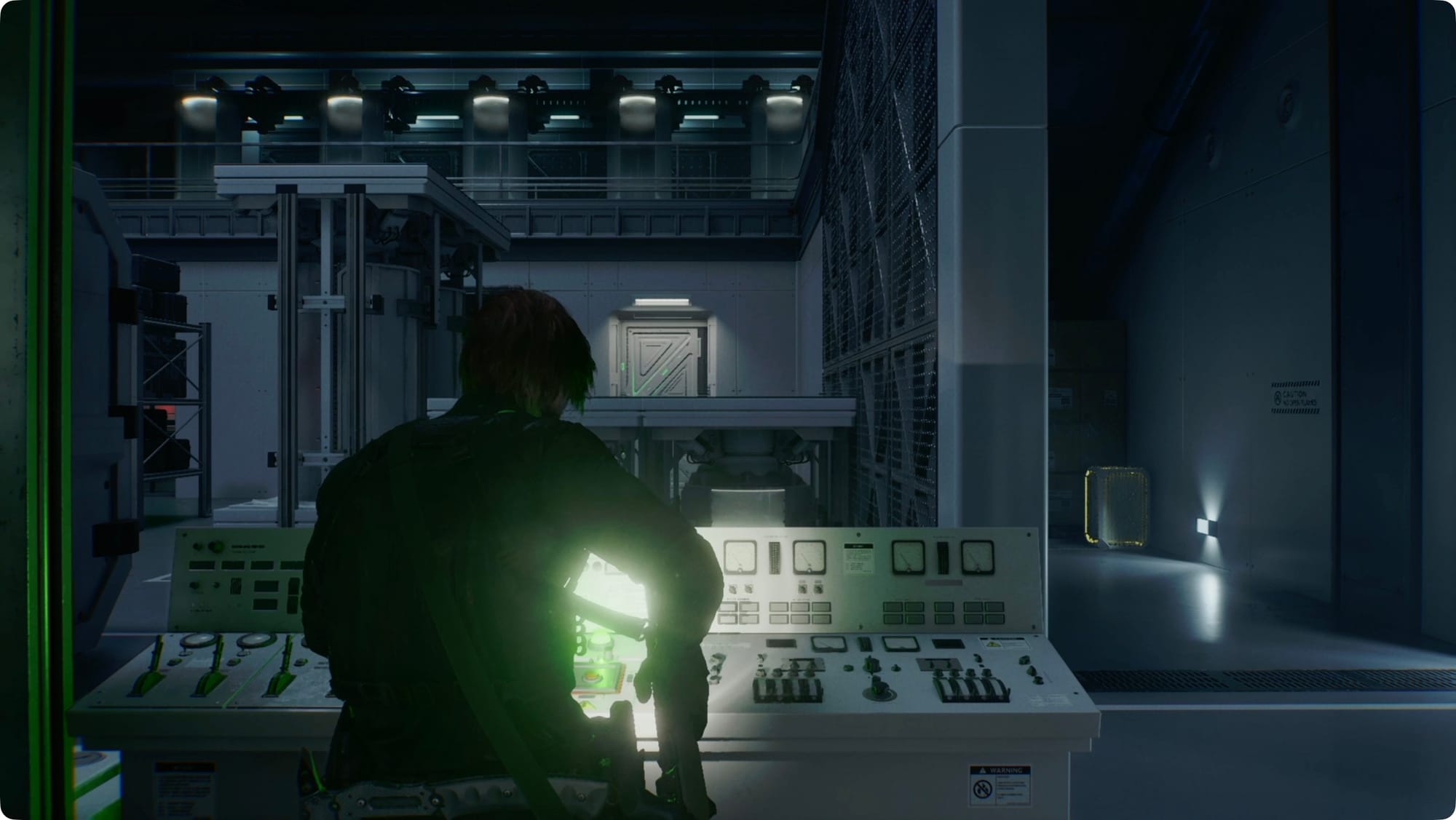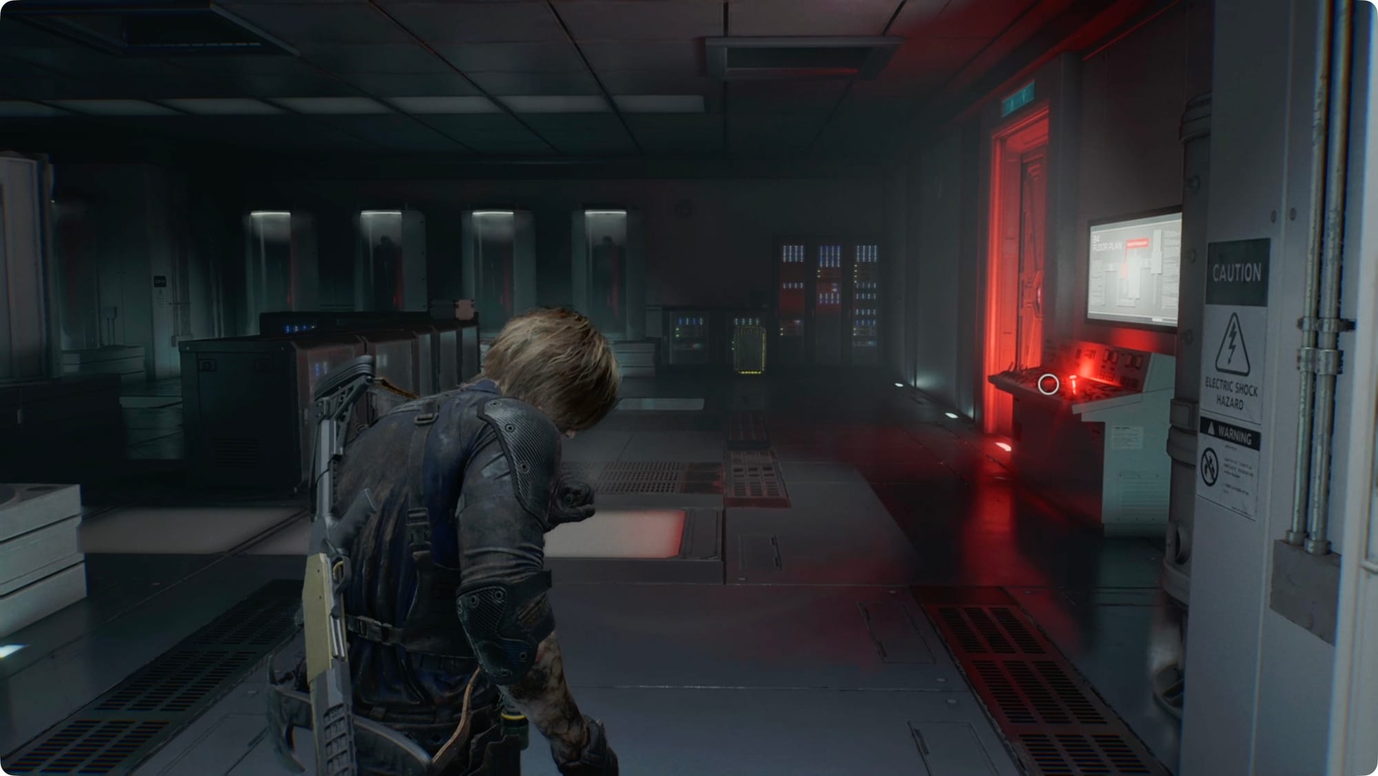 Walk up to the giant wall of screens and interact with the terminal. For a cutscene.