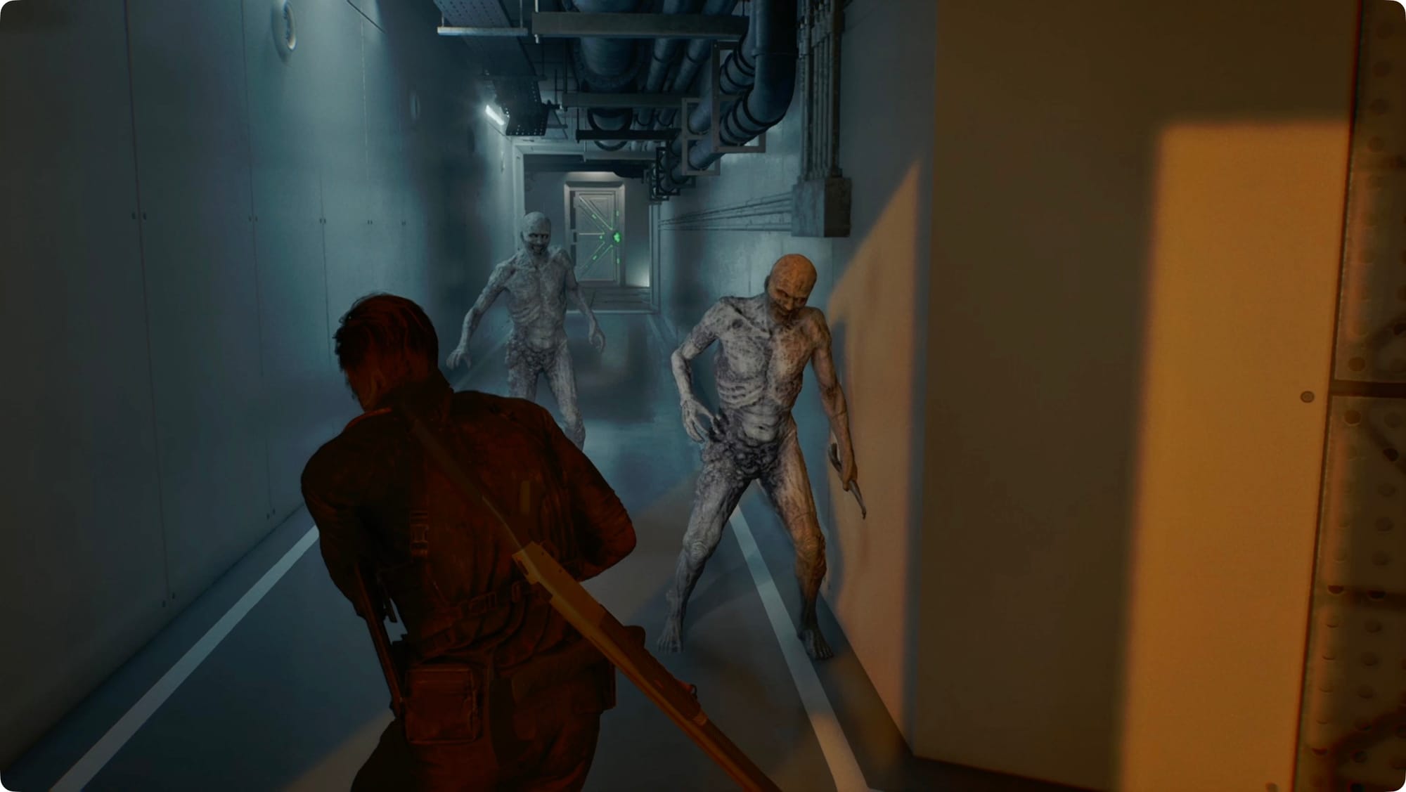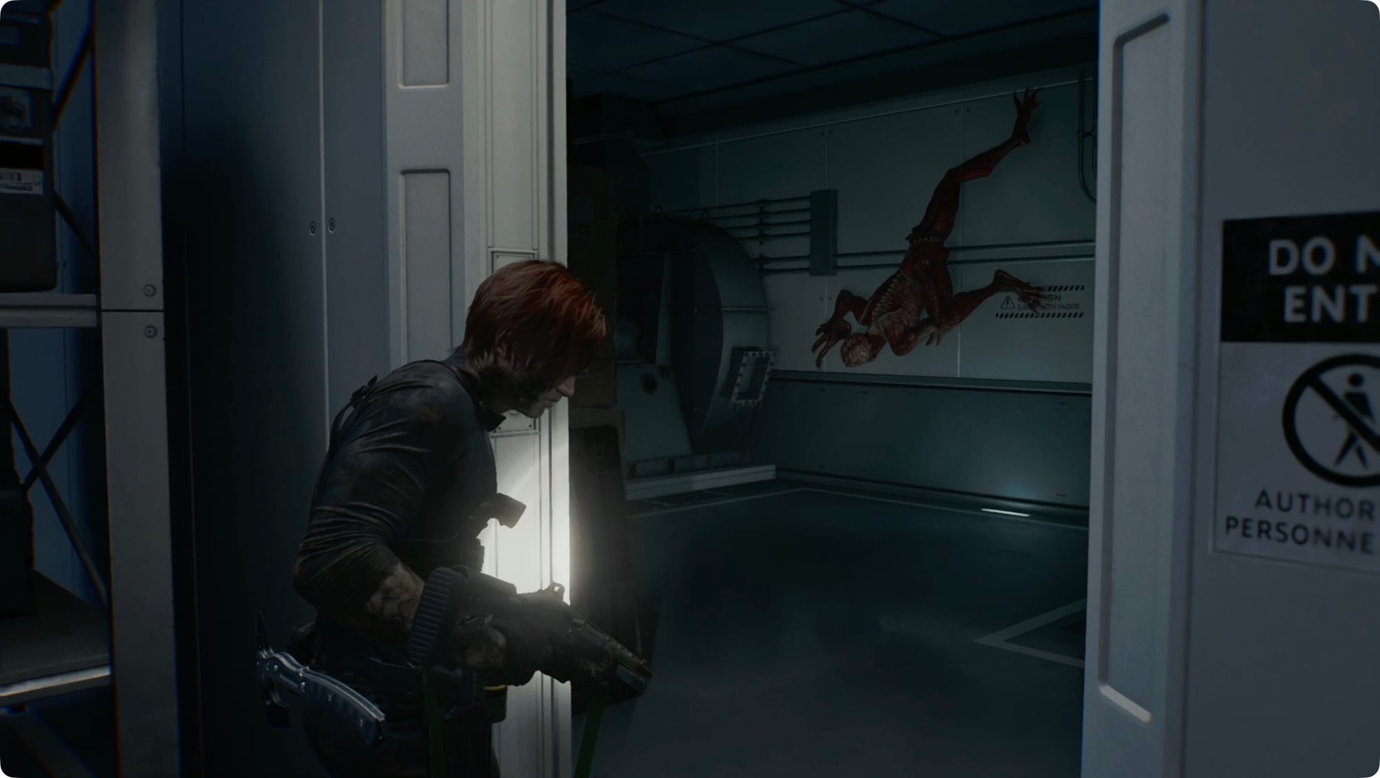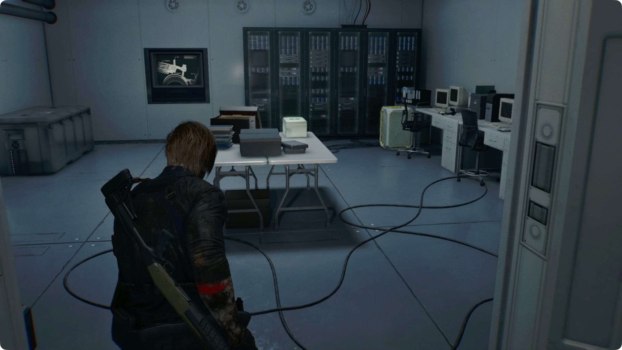Follow the hall around and then past the room we need. As you cross the catwalks, you’ll have to deal with a few Lickers. At the far end, drop down to the floor.