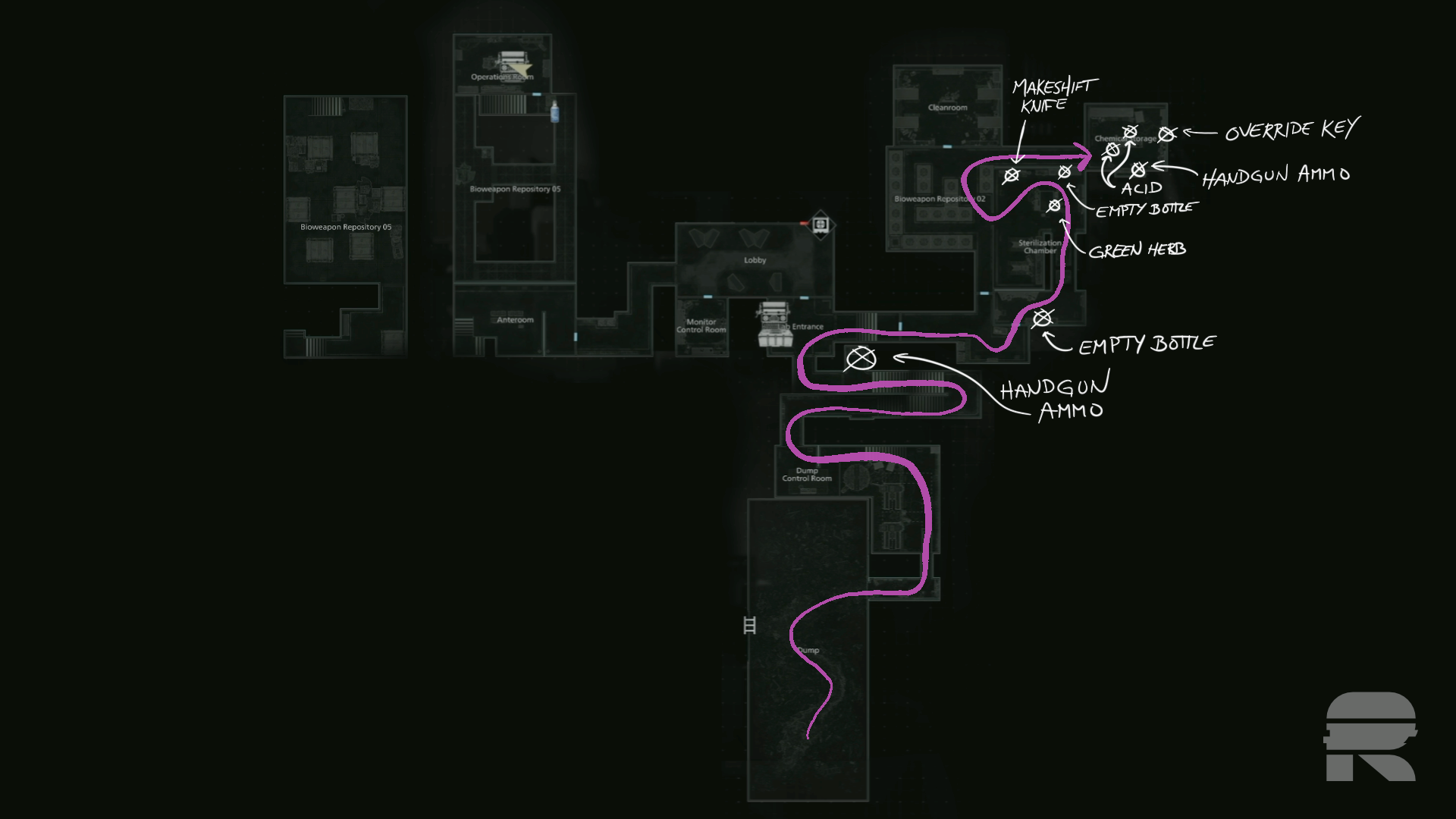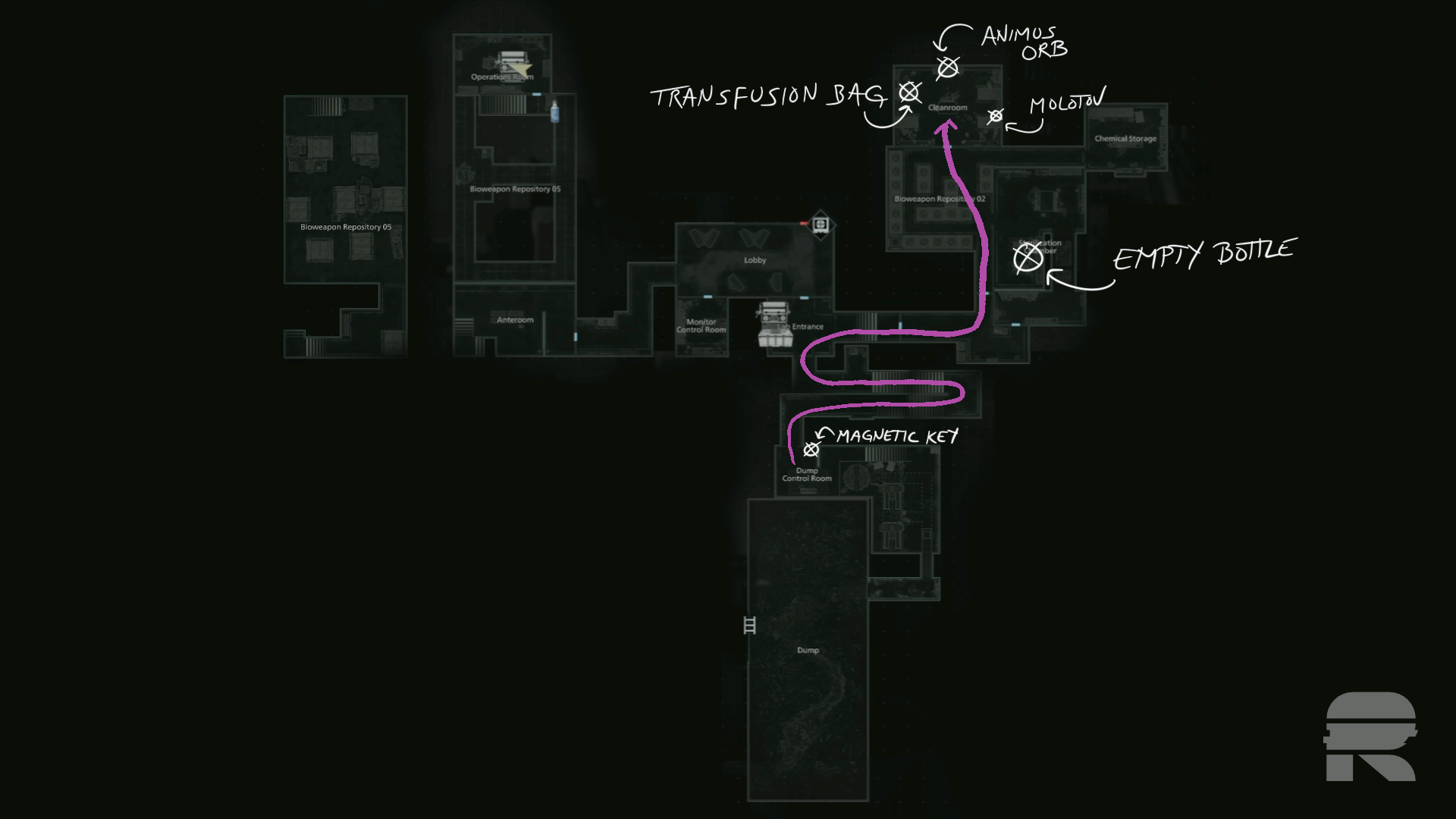 Back in the Bioweapon Repository 02, take a left and deal with the zombie there. Keep heading south. As you pass, duck into the south part of the Sterilization Chamber. There’s an Empty Bottle between the two beds. Either deal with the zombie or just get out of there quick.