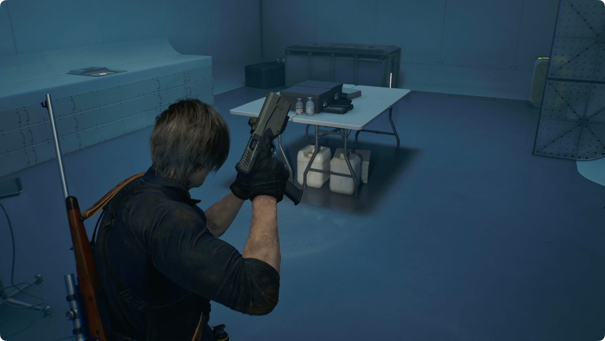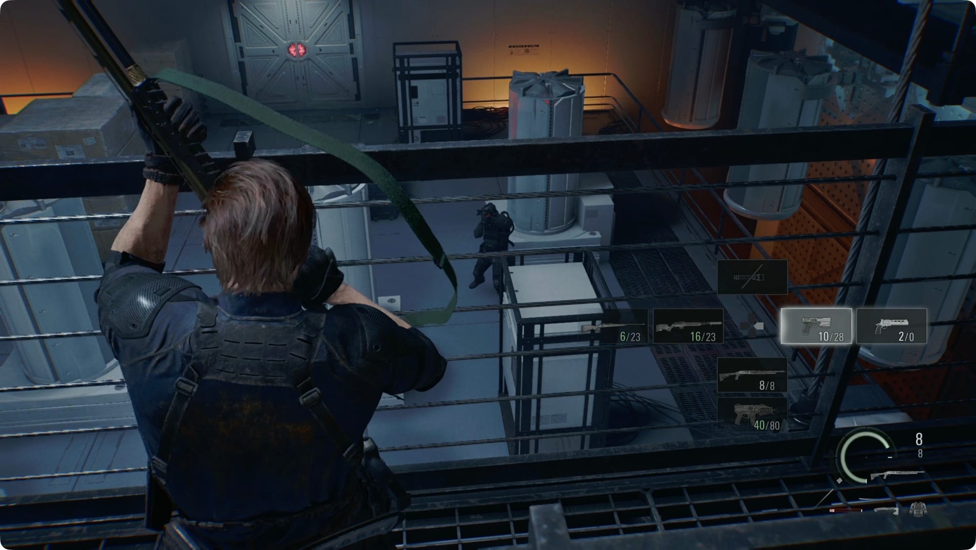 In the next room, there’s a trio of guards off to your left. Get behind something and snipe them from here. Smash the crate ahead of you for some Handgun Ammo. Climb the ladder and take the catwalk across to the other side of the room.