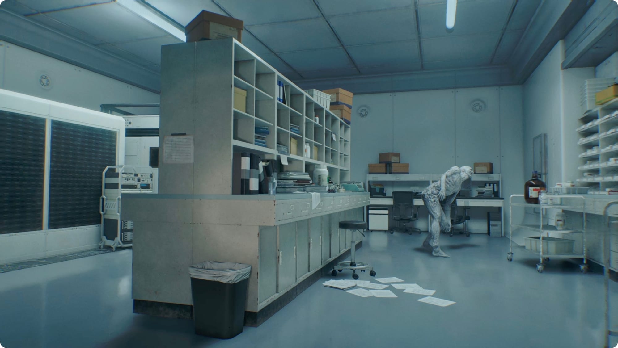 Check on the east side of the room for the Bioweapon Pod which will be a problem for later. Head through the door and take a left. You’ll come back to the Staff Room at the top of the stairs.
