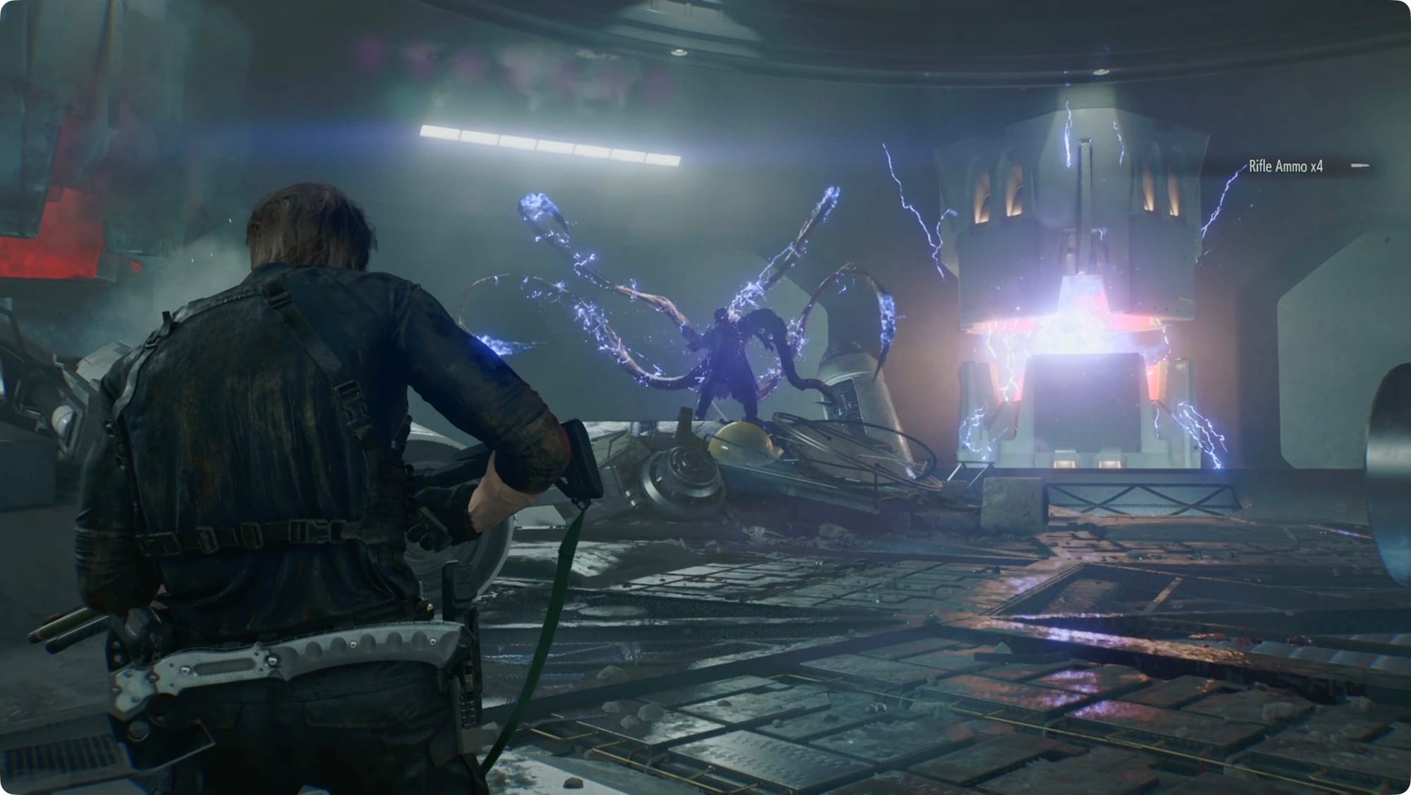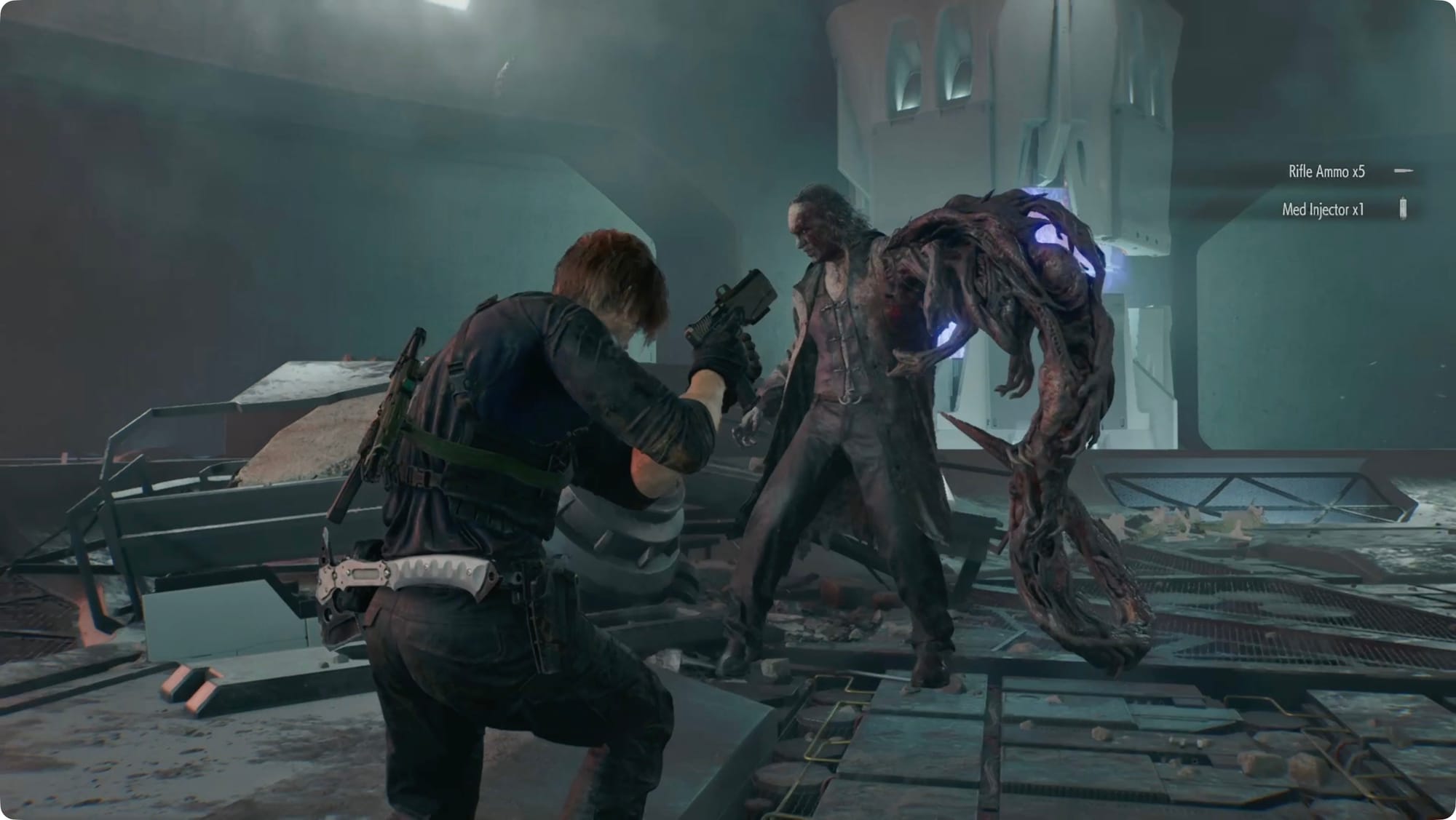 There’s a lot of ammo and other items scattered around. During the fight, watch for two Med Injectors, two boxes of Shotgun Shells, some Handgun Ammo, and a box of Rifle Ammo.