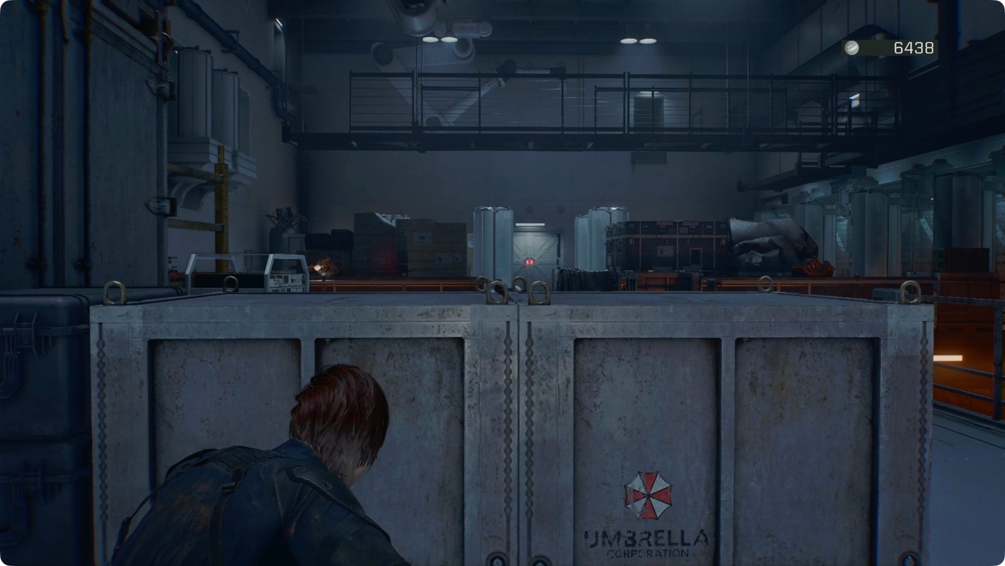 Drop down and start picking up anything the guards dropped. There’s also a crate with Machine Gun Ammo in the southeast, a Green Herb in the southwest, and a crate with Shotgun Shells in the northwest. There will also be another wave of guards.
