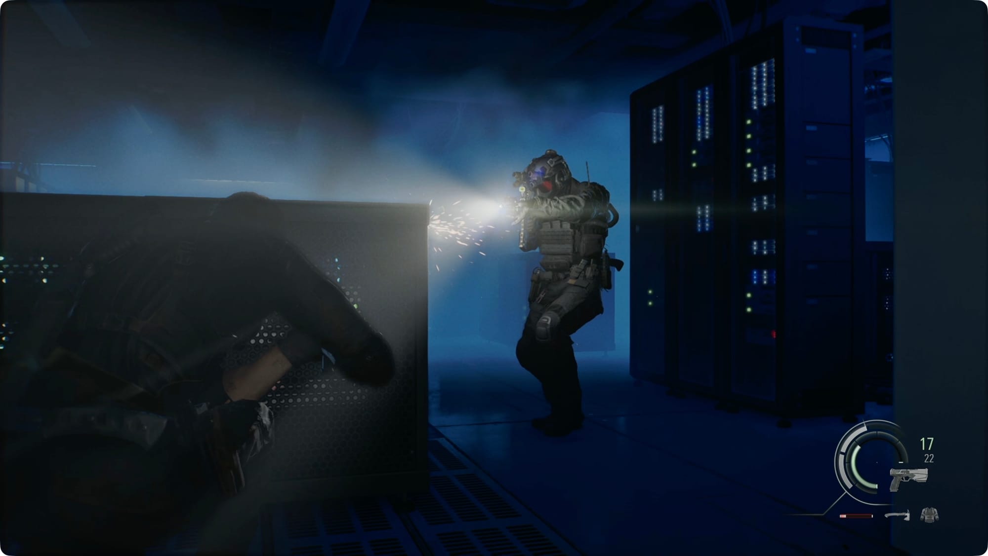 Those guards are not fucking around, so be ready when you go back into the Server Room. Stick to the edges and use the canisters scattered around to create some fog cover.