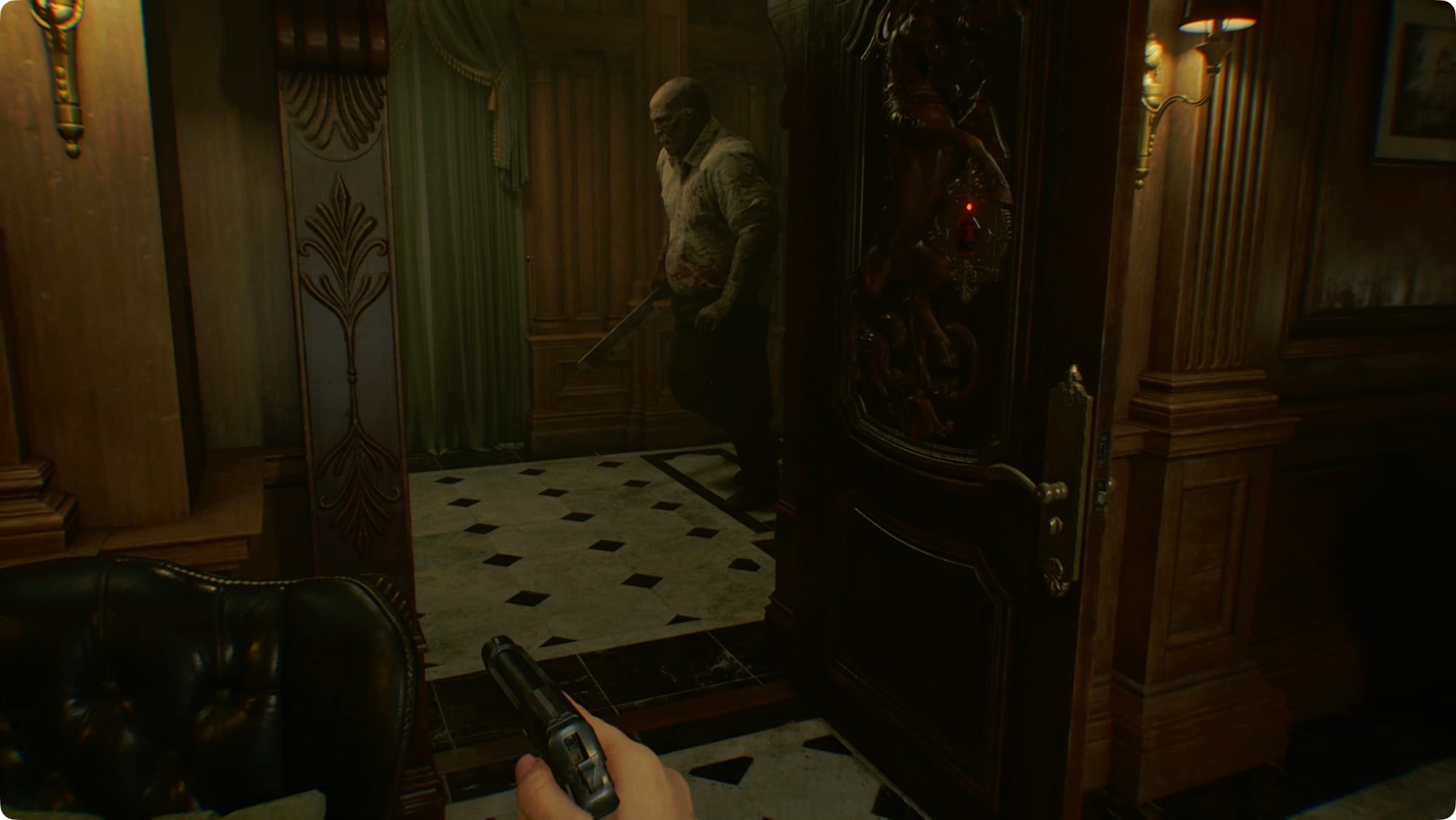 Leave the Filing Room through the window or door and take a left. Grab the Antique Coin from the table as you pass. Just before the stairs, there’s a crate with some more Handgun Ammo. Which is nice, because there’s another zombie coming down the stairs. It’s only a handful of bullets, and you’ll probably need most of them to take him out.