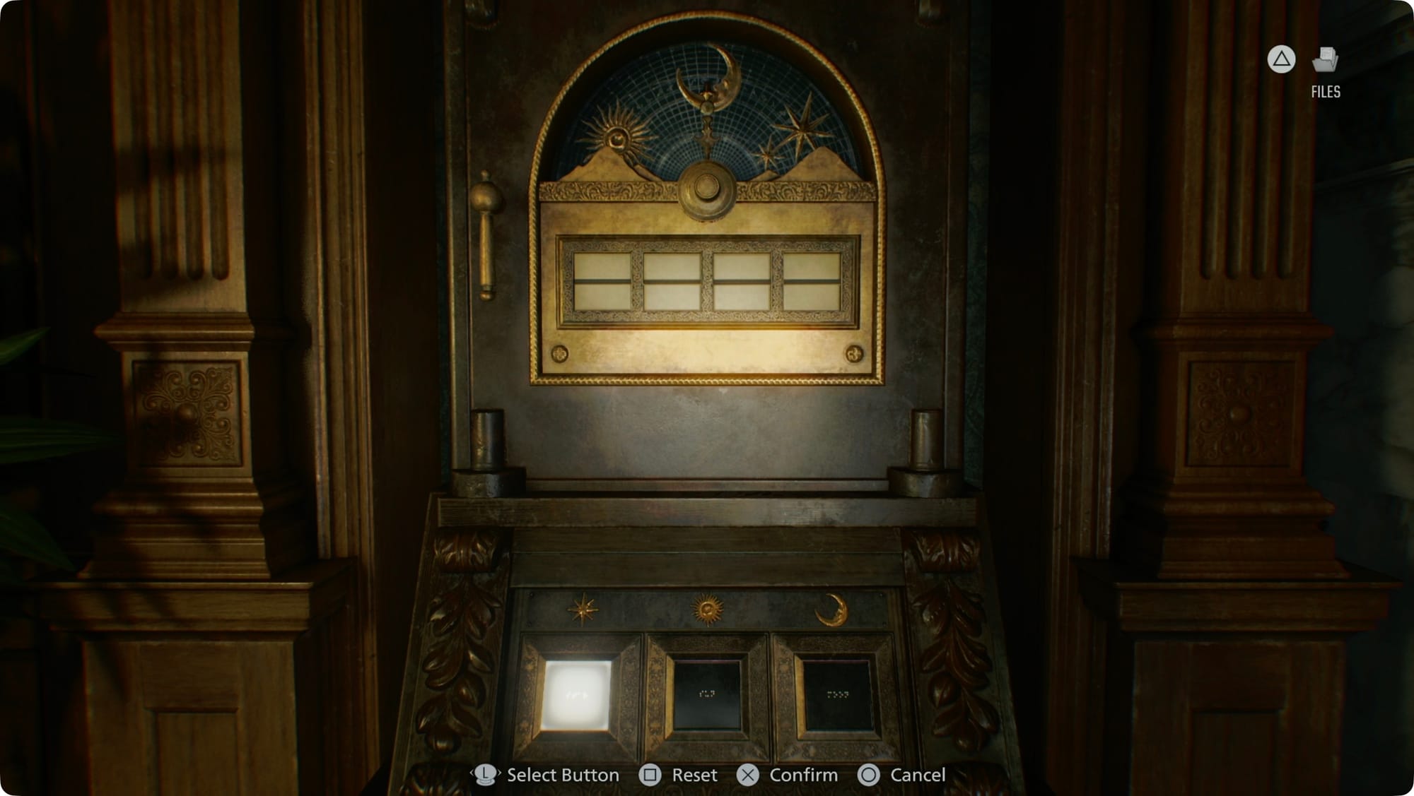 Head down the stairs on the right side. Check the main door — Door with Indents — for a clue (Sun, Moon, Star) about what you’re looking for. The door at the top of the other staircase is locked, so keep heading down to the main floor.