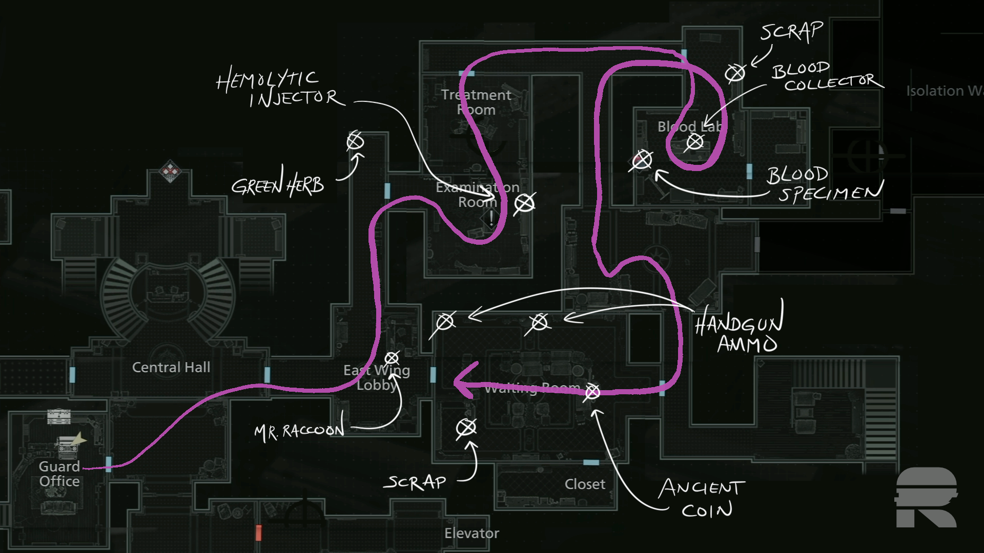 It’s actually worth it to run back to the Central Hall and the Guard Office to save and visit the Item Box. We’ve got two Empty Injectors and a whole lot of blood laying around, so let’s go make some drugs!
