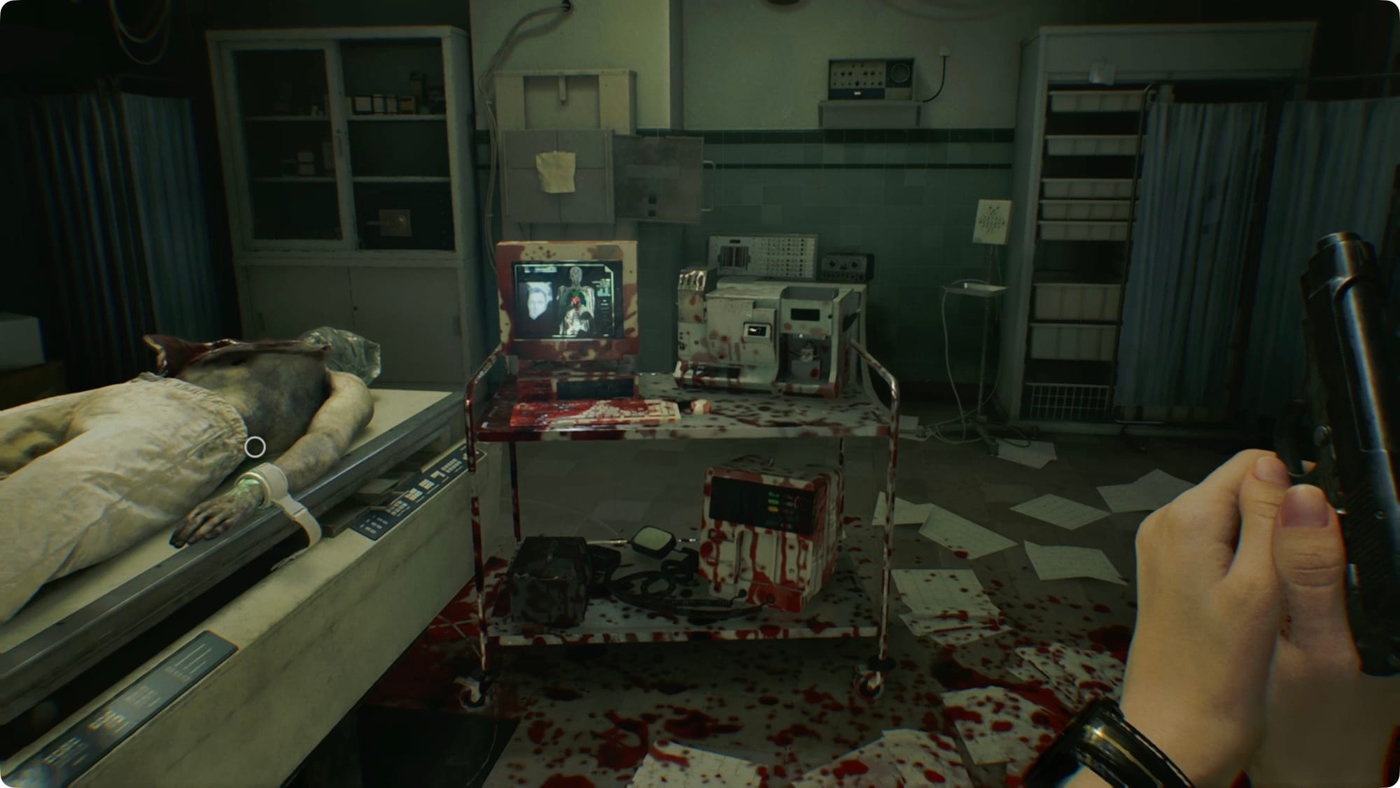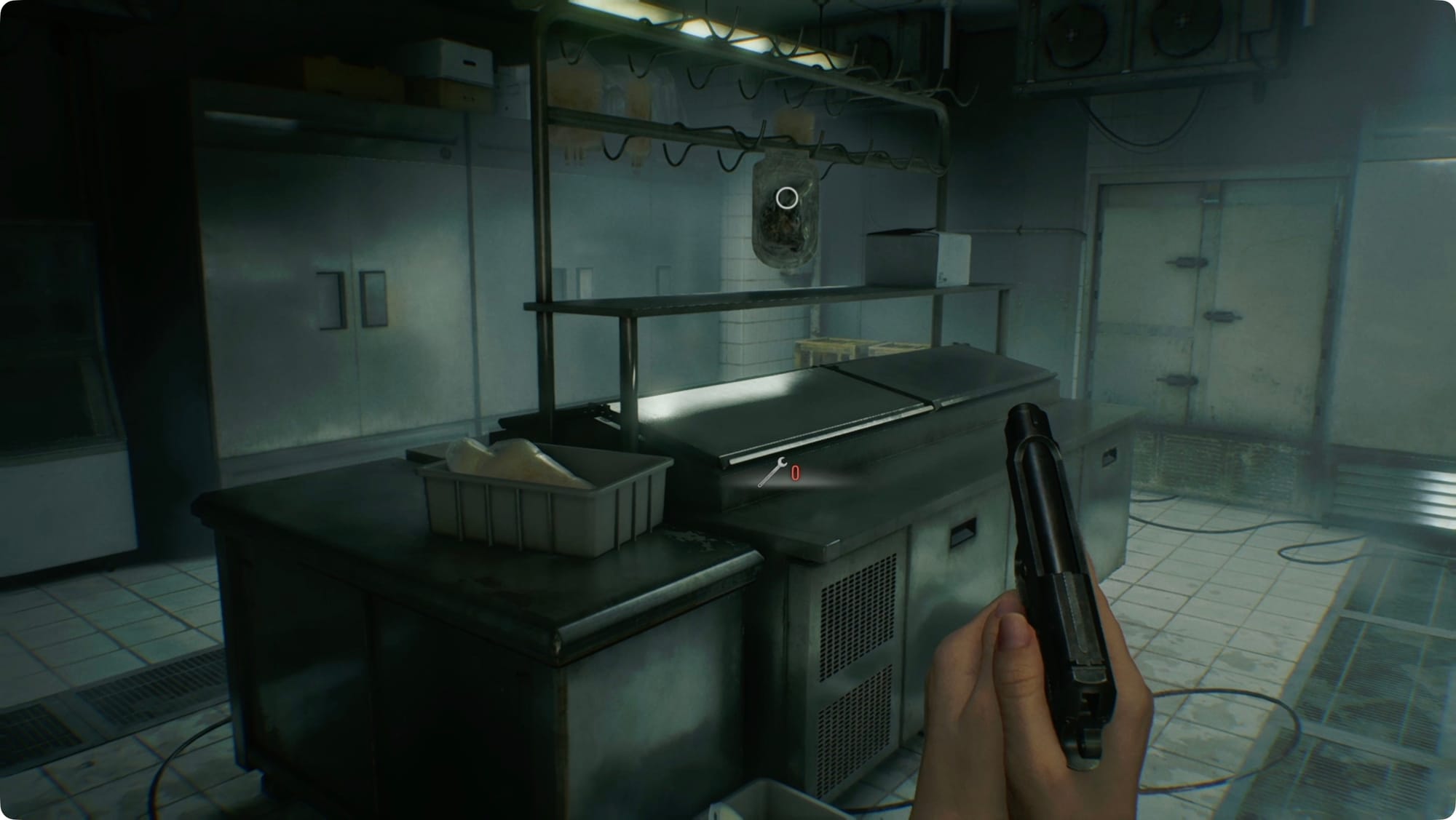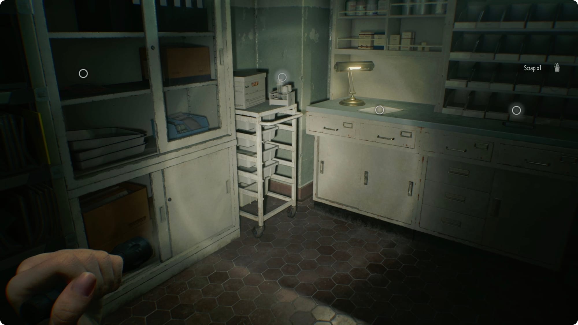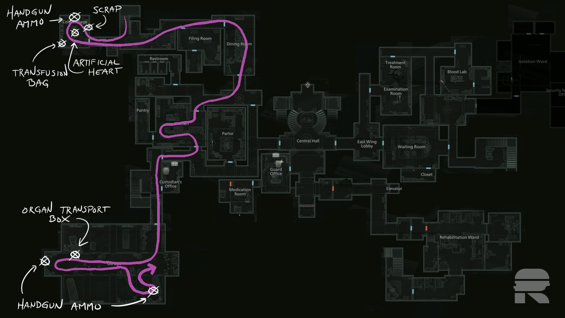 Inside, there’s a Transfusion Bag ahead of you and some Scrap to the right. Use them to make a Hemolytic Injector (you’ll need it in a sec). Smash the crates at the back for some more Handgun Ammo. Grab the Artificial Heart from the rack in the middle of the room.