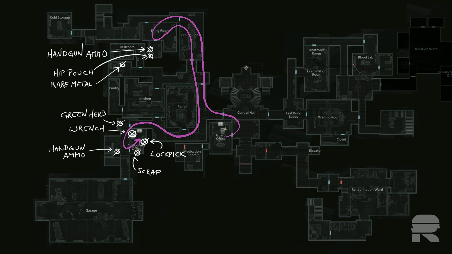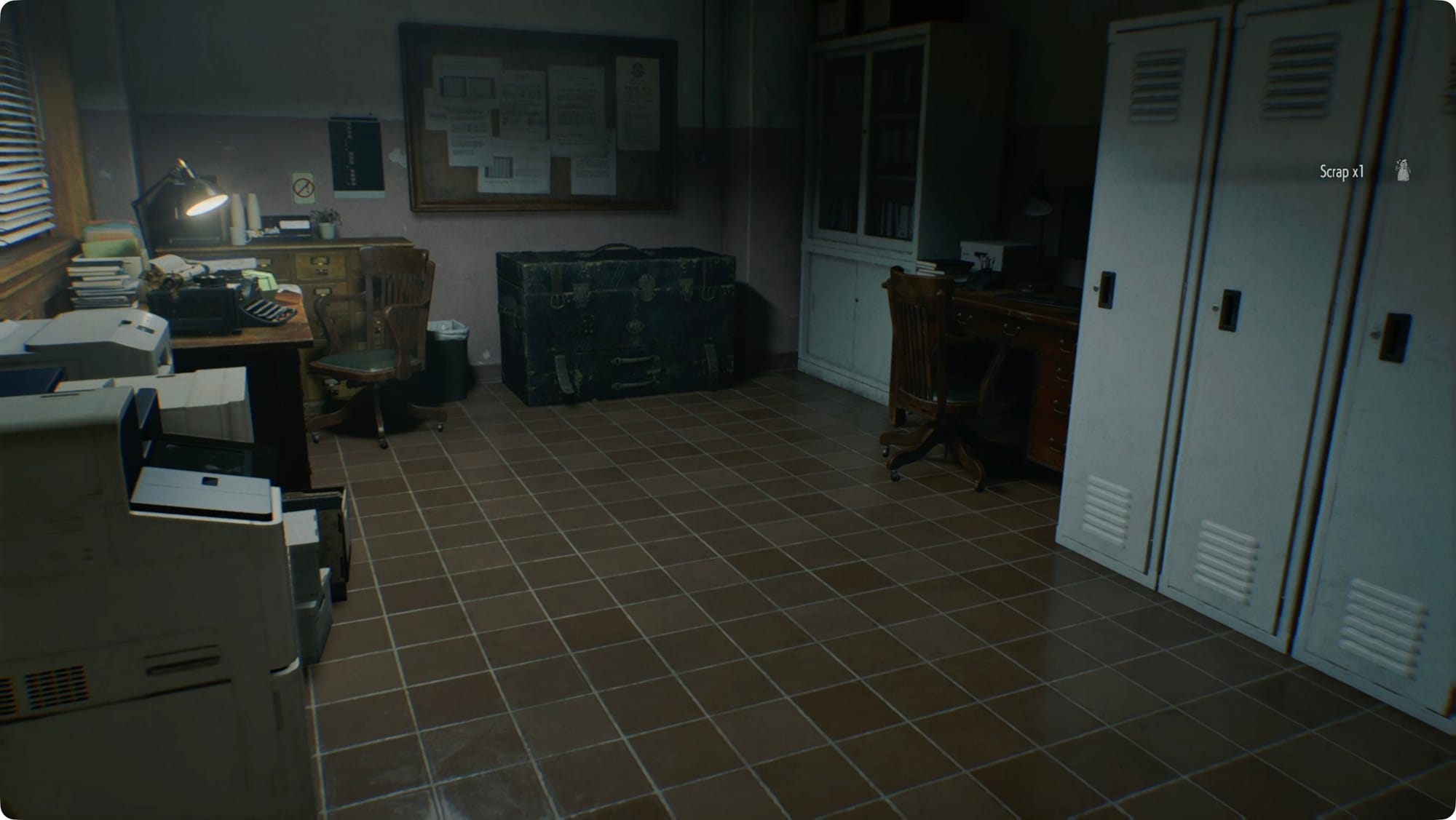 Grab the Green Herb and take a left. Ignore the stairwell on your right, watch the right wall for the Construction Notice, and go through the first door on the left to enter the Custodian’s Office. Grab the Scrap, and open the second locker for another Lockpick.