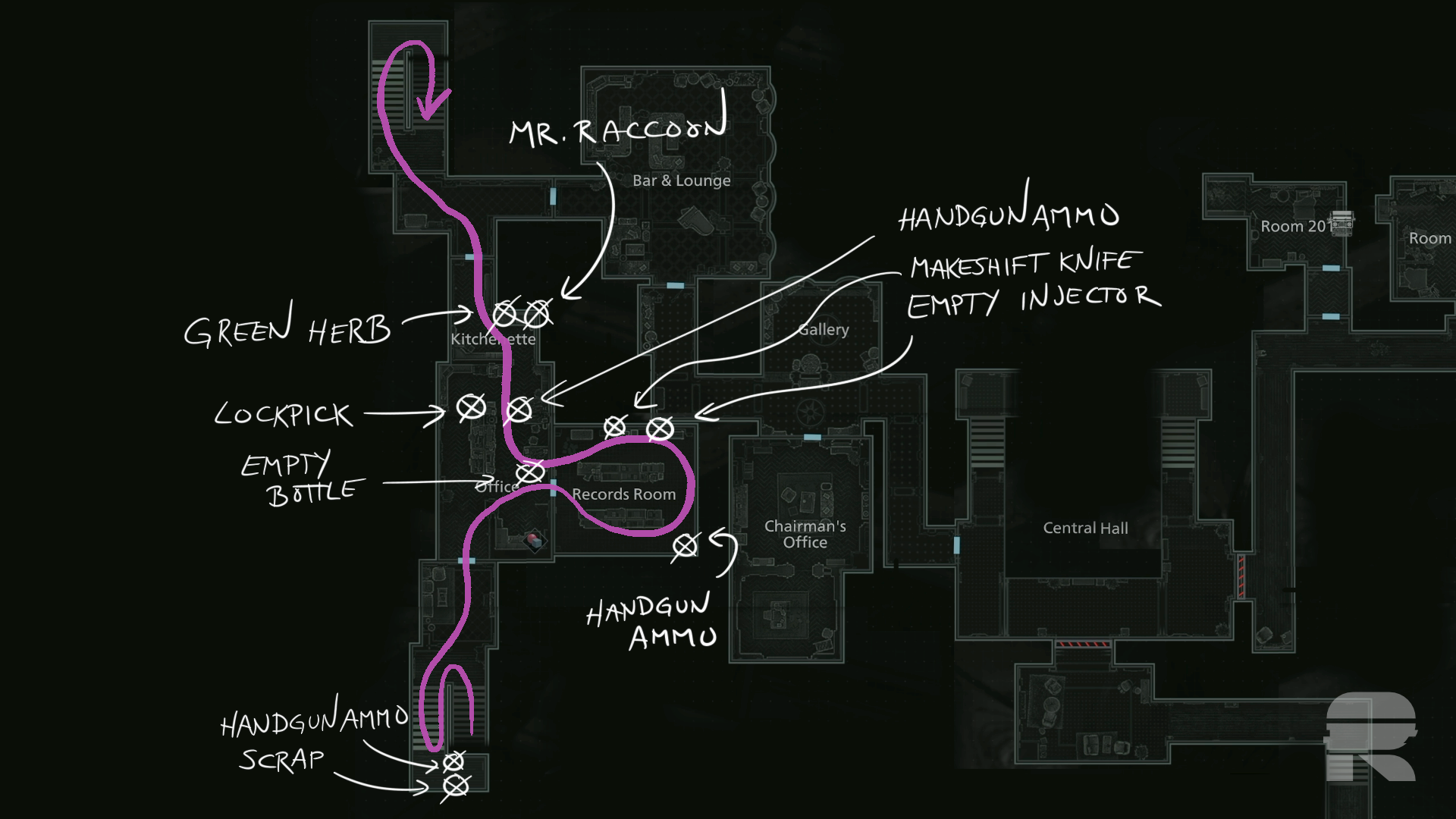 In the back right corner, there’s a Handgun Ammo crate. In the middle, read the Disposal Team Report. Along the north wall, grab the Empty Injector and open the locker for a Makeshift Knife. You can hear a Mr. Raccoon, but he must be in the wardrobe we can’t open. Back in the main room, take a right for a Handgun Ammo crate and the Background Check note. There’s another Lockpick on a desk to the left.