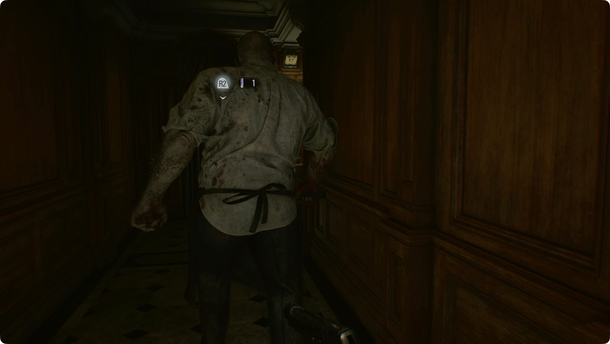 Unlock the door leading west and cross back to the West Wing. Pause in that first hallway until you know where the patrolling butcher is. Wait for him to pass, and then Hemolytic Injector him. He’ll drop the Pantry Key.