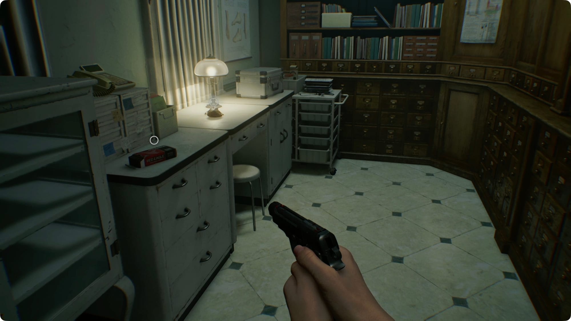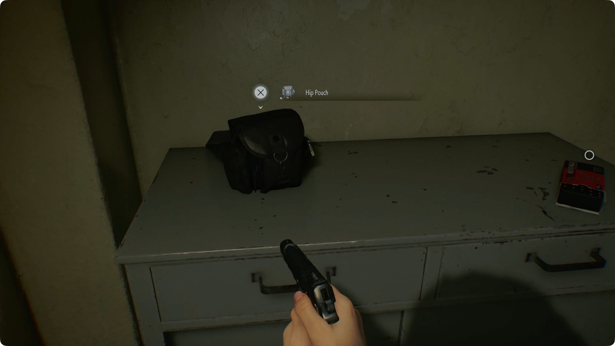 When you get there, use the ID Wristband on the door to access the back room. There’s a wardrobe we can’t open yet, but that doesn’t matter because there’s another Hip Pouch to grab. Pick up the Handgun Ammo as well.