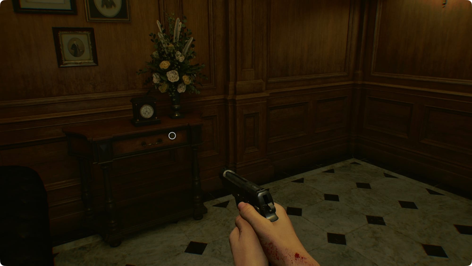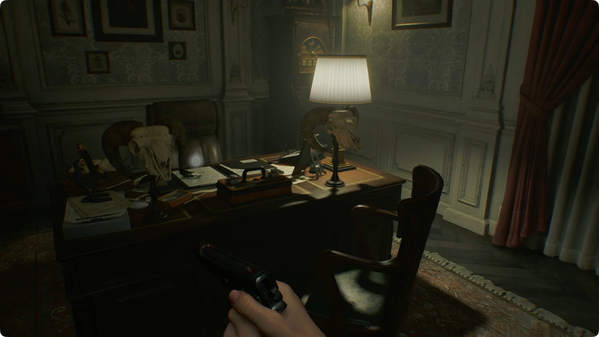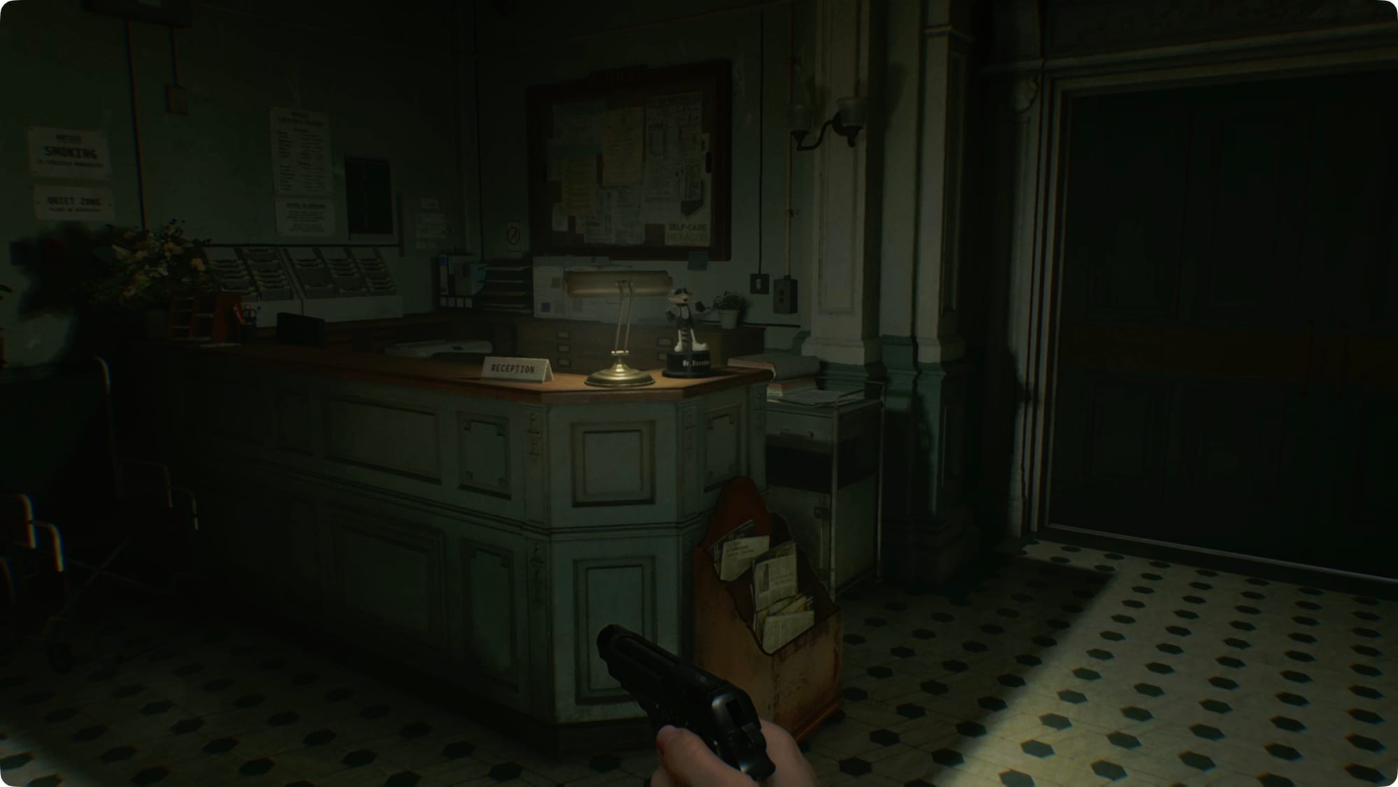 Back at the entrance, grab the Antique Coin and then go back to the right side. There are two vases to smash, both with Handgun Ammo. Cross all the way to the left and behind the desk. There’s another safe we can’t open and a Safe Replacements note. Turn around and open the drawer for some more Scrap. Use it to make another Hemolytic Injector (and then you can dump the Transfusion Bag in).
