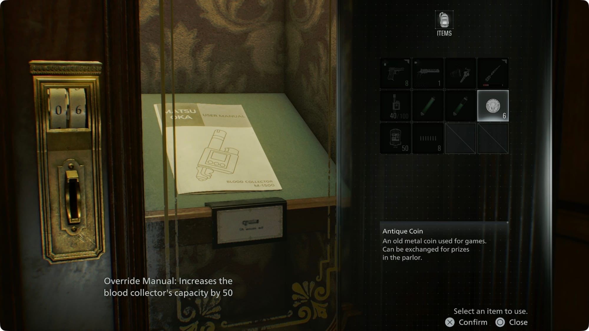 Duck into the Parlor and buy the Override Manual for the six Antique Coins you have. This increases how much blood you can collect.