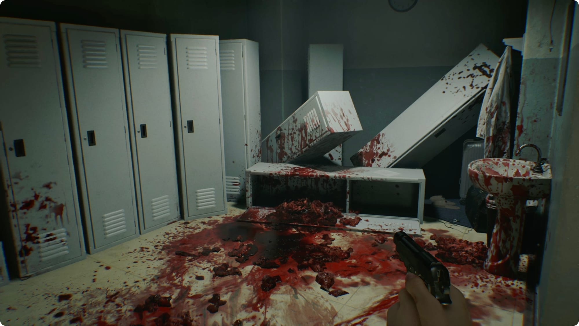 Go back to where you picked up the Level 1 bracelet. Go past the corpse and take the right. In the locker room area, smash the crate for some Handgun Ammo and open the lockers for some Scrap.