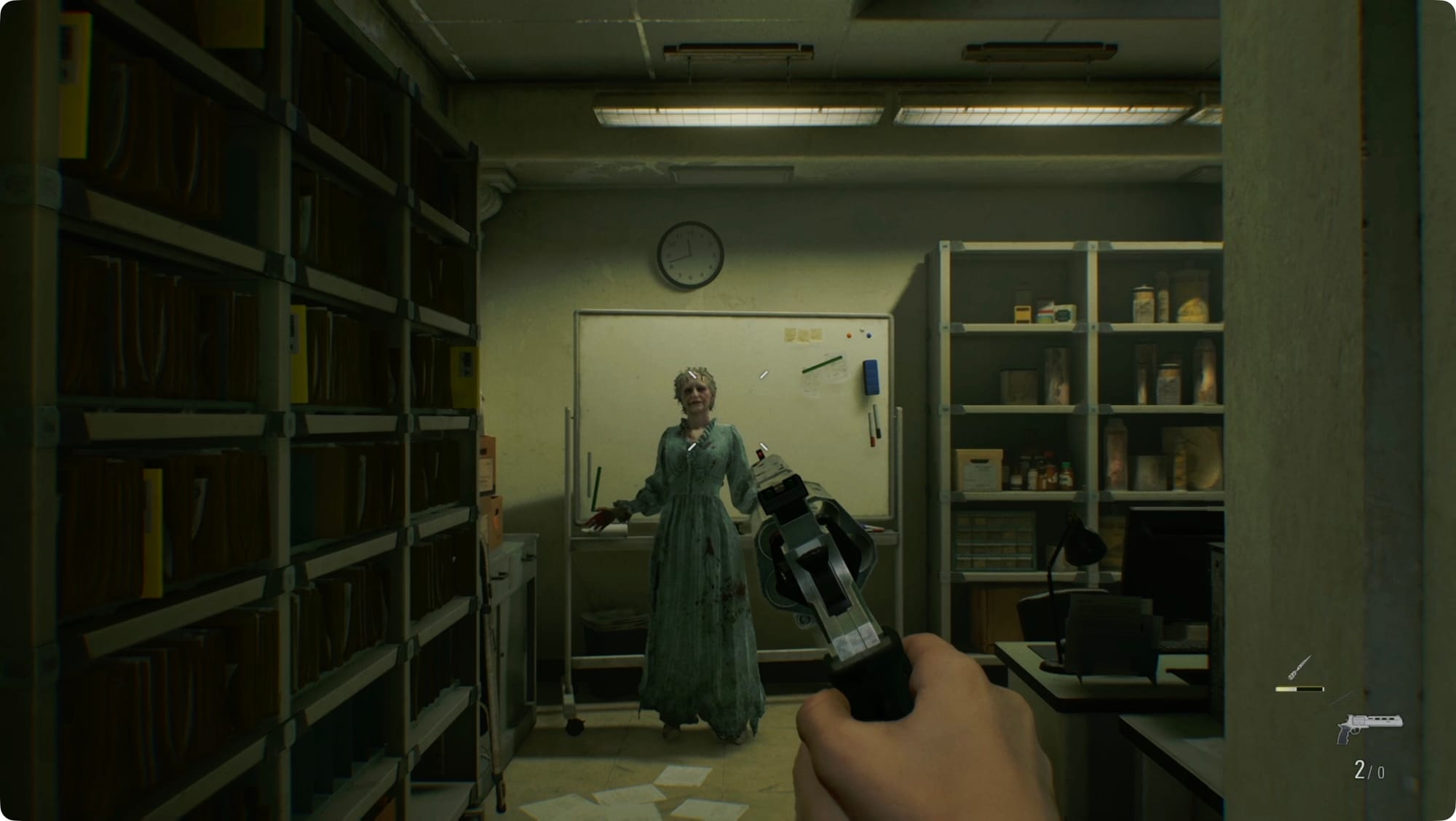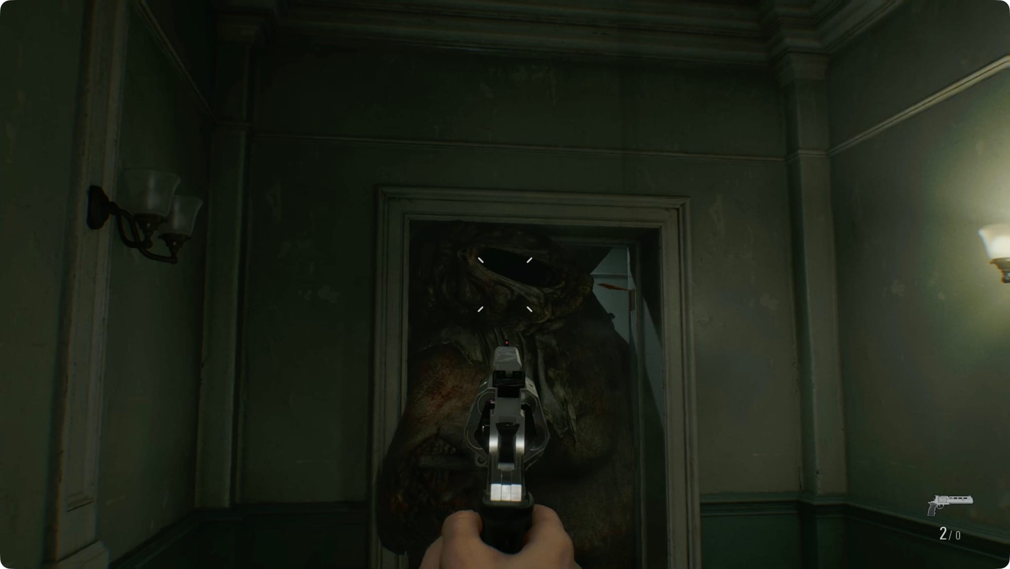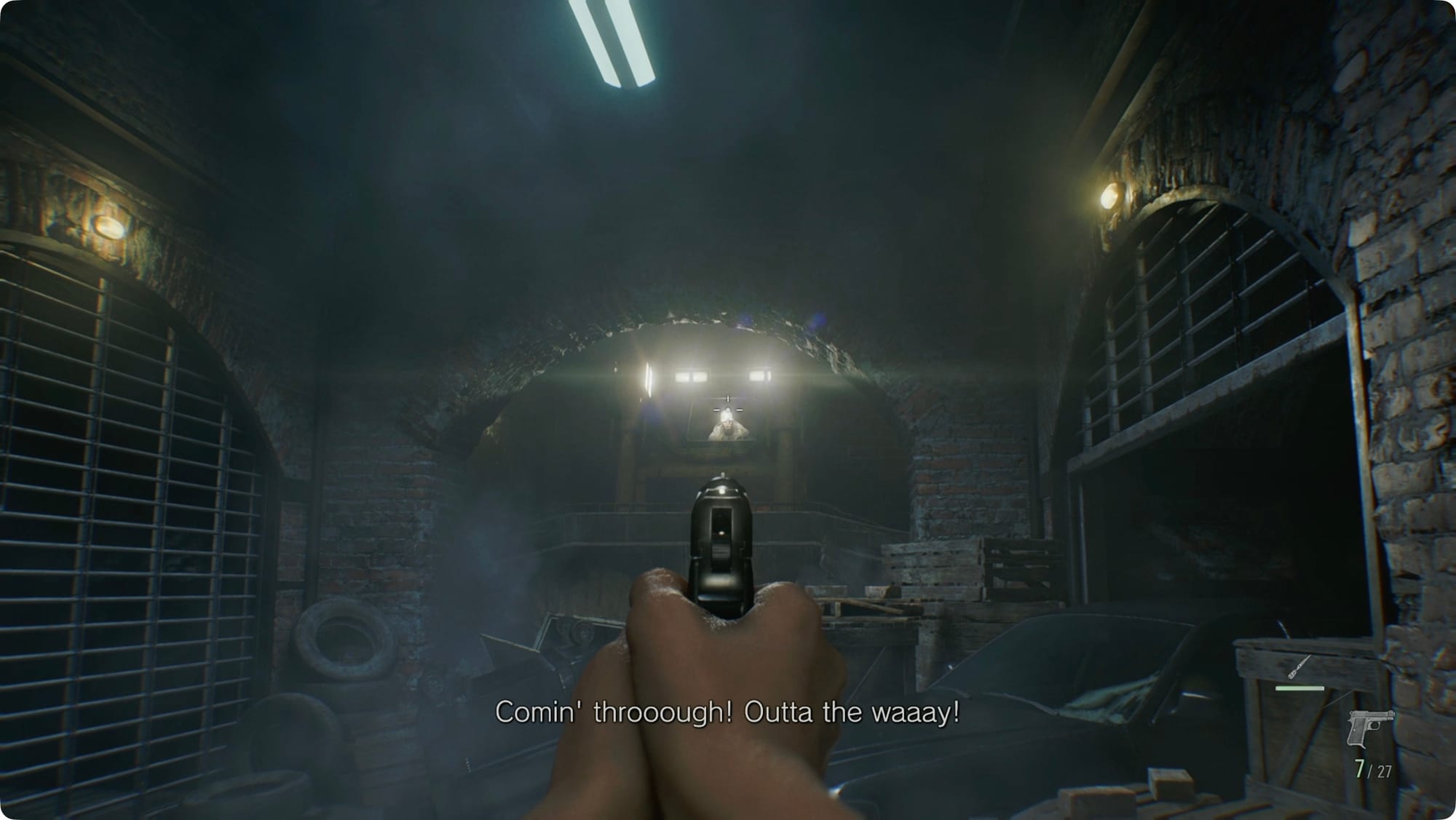 When you start back up along the Garage, a gigantic bulldozer will come at you. All you have to do is calmly put a couple bullets into the driver’s head. It’s easy to panic, but just stand still and aim carefully. Wait for the recoil to reset before you fire again.