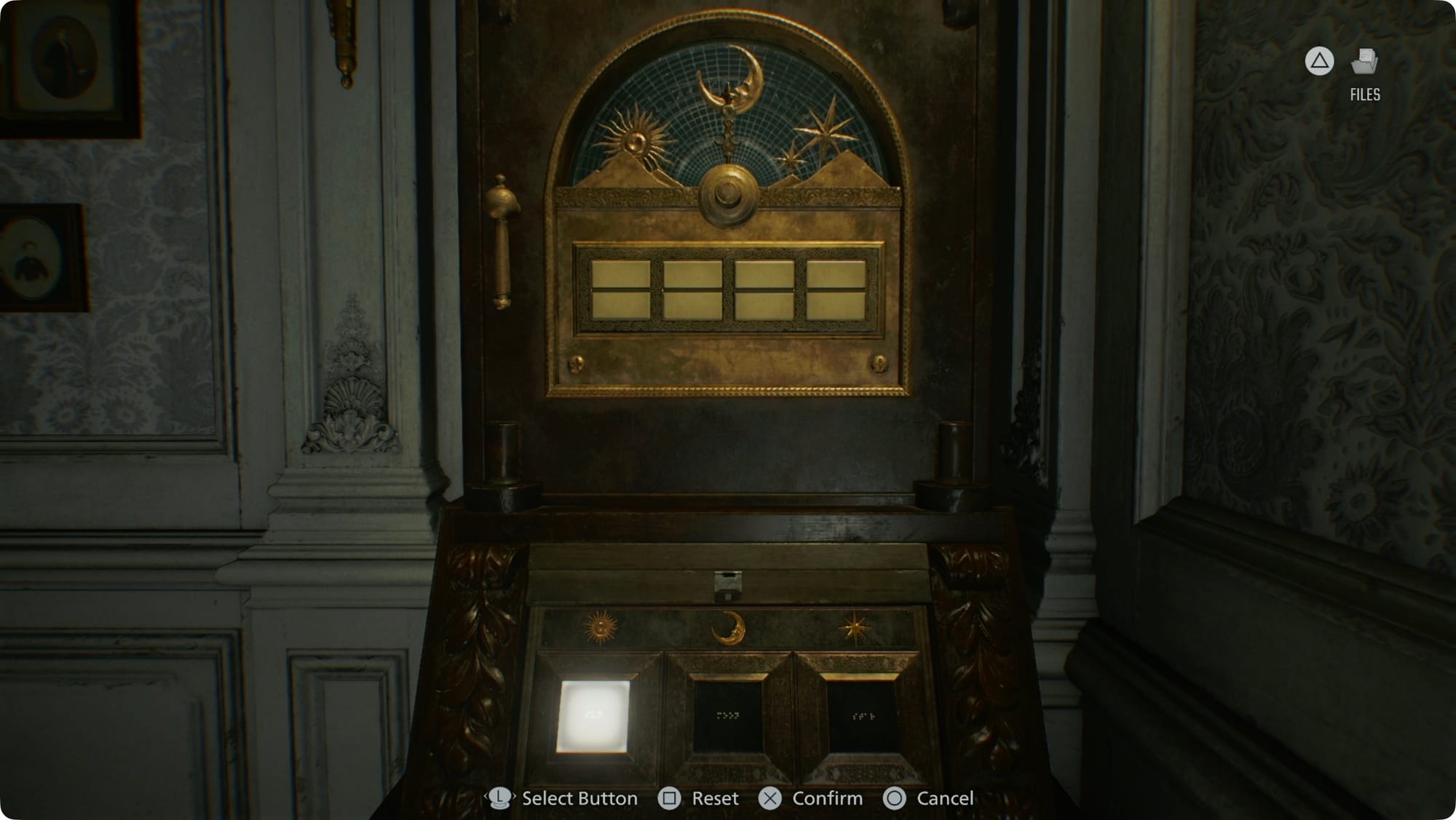 Past the typewriter, push through the door into the next room. Working counterclockwise, grab the Green Herb, Lead Researcher’s Picture 2, Lead Researcher’s Picture 3, and Lead Researcher’s Picture 1. Picture 3 is a red herring. Pictures 1 and 2 give you another code for another puzzle box — Star, Sun, Moon, Sun — but the puzzle box in the corner is locked. Opposite the puzzle box, you’ll find the Lead Researcher’s Message with a hint for how to destroy that lock.
