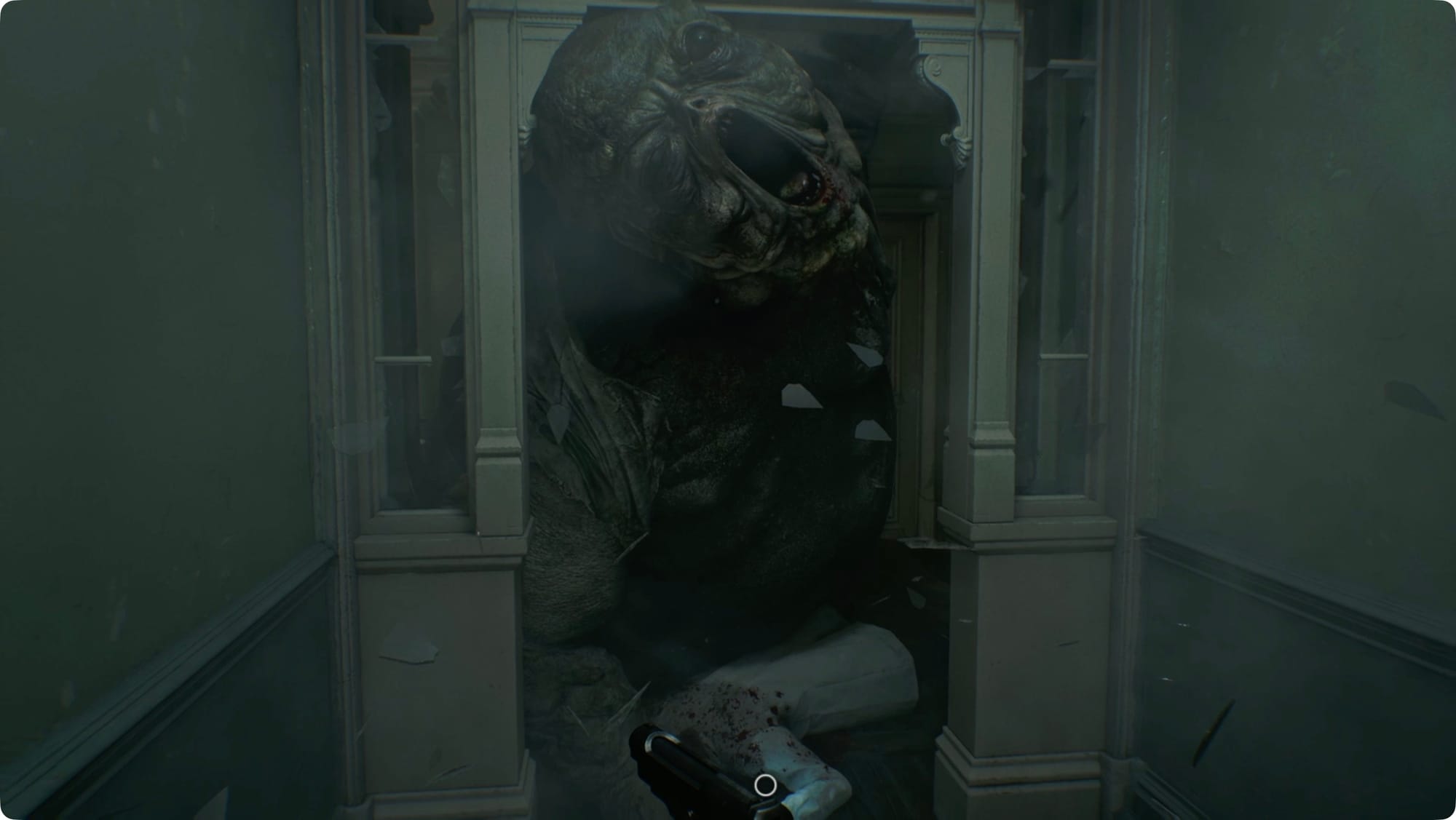 You can outrun him easy enough and he can’t fit through doorways, so you’ve got options here. However, for the next step to work, you can’t run into the office (I don’t understand why — I think because he doesn’t turn around in the hallway). Instead, run downstairs and back into the Waiting Room.