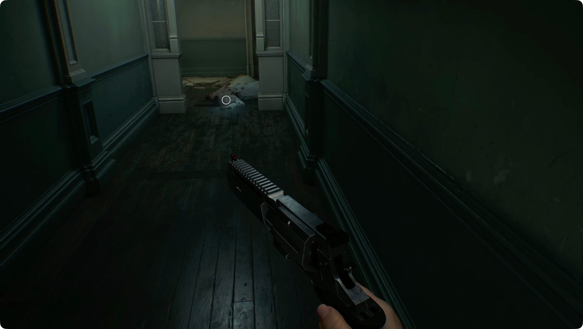 There are three zombies that are about to stand up and one singer zombie in the other room. She’s going to scream and shatter all of the windows. It’ll suck, but she’ll stay where she is. Deal with the other three (I recommend Requiem to make it quick). They’ll drop a Med Injector, a Hunting Knife, and some blood. Just make sure to save (or make) one Requiem round for the singer. When she's dead, she’ll drop another Antique Coin. There’s also two crates nearby that probably got broken in the scuffle. Grab the Handgun Ammo inside.