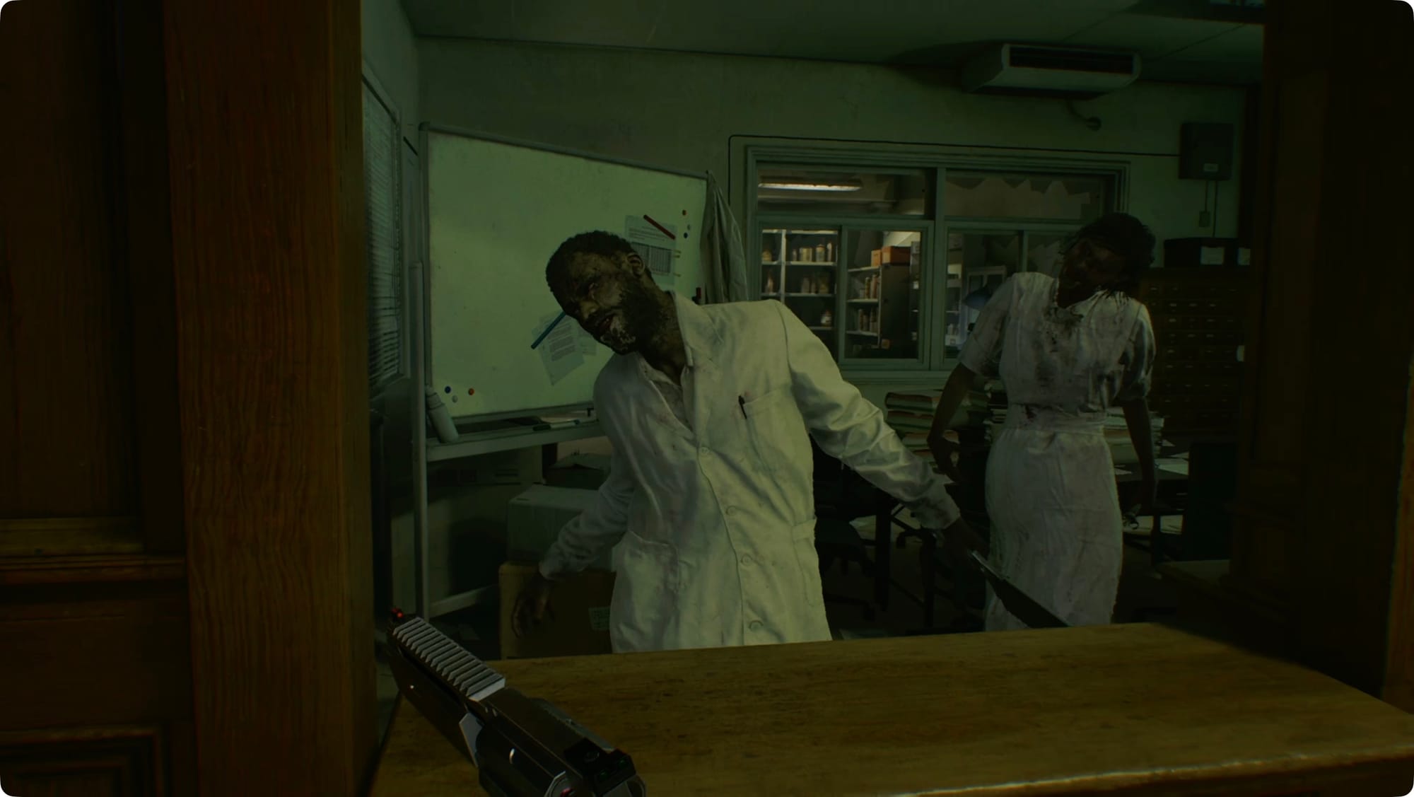 Sneak up on the doctor zombie (zombie doctor?) and use it for a stealth (well, “stealth”) kill. You’ll still have to deal with the other zombie the old-fashioned way. Go out through the door on the north wall.