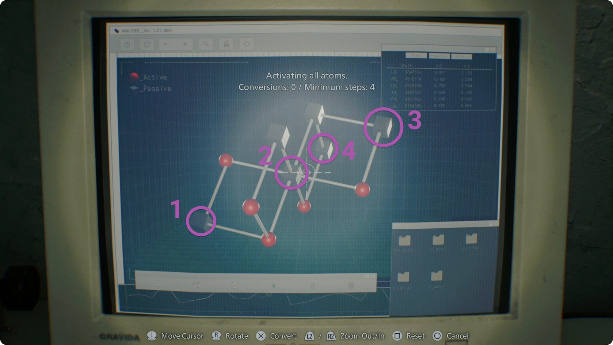 Scan the Reversible Blood Specimen while you’re here. This one is in 3D, so it’s more intimidating than it looks. Start with the bottom left point. Then, hit the very center atom. Then hit the top right point. Finally, hit the atom that’s farthest away from you. Now you can craft Steroids and Stabilizers.
