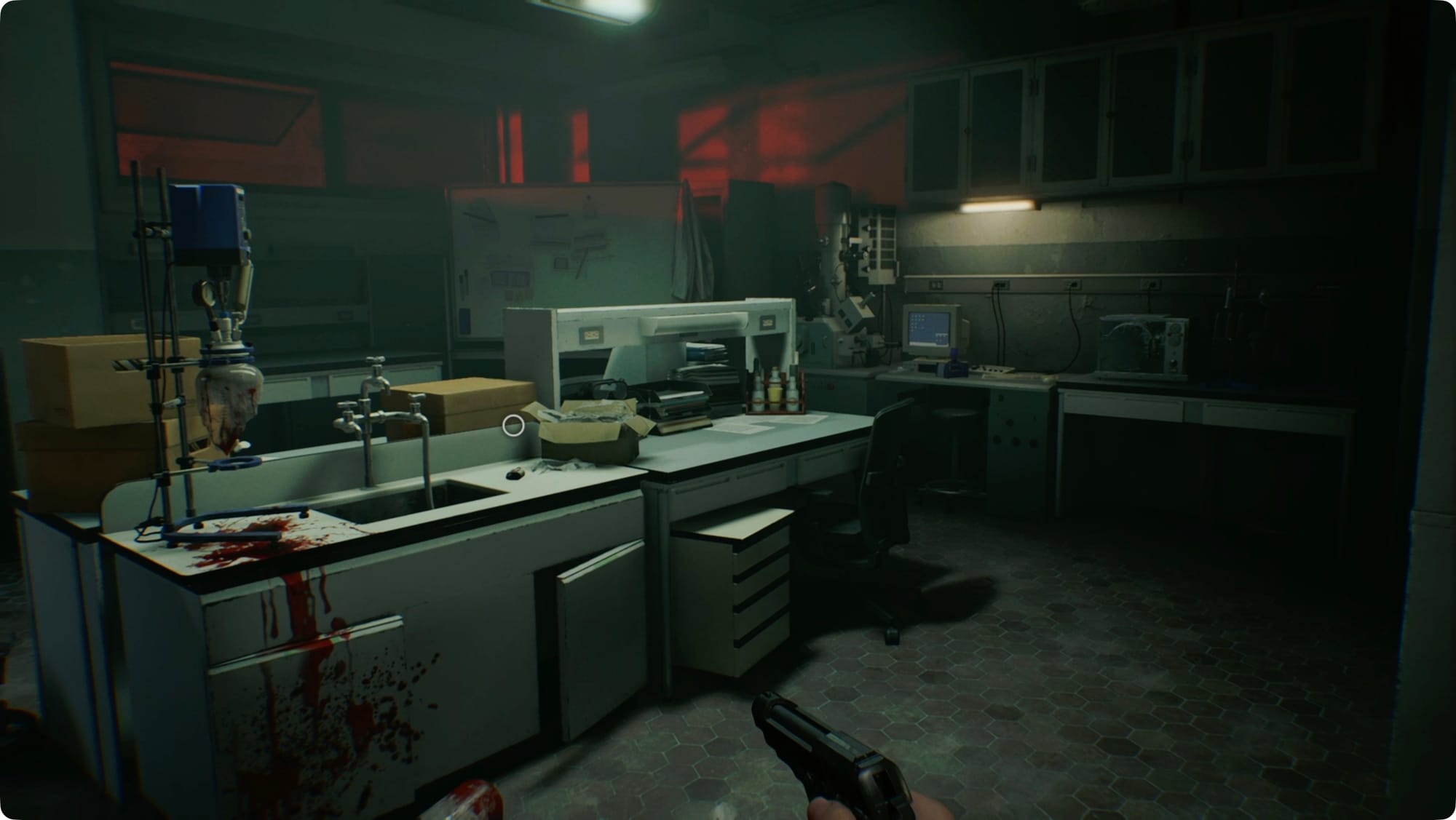 In the locker right ahead of you, grab the Scrap. In the main room, grab the Blood Collector ahead of you and then go to the computer on the right. Grab the Blood Specimen (Denatured) and put it in the laser microscope to the left.
