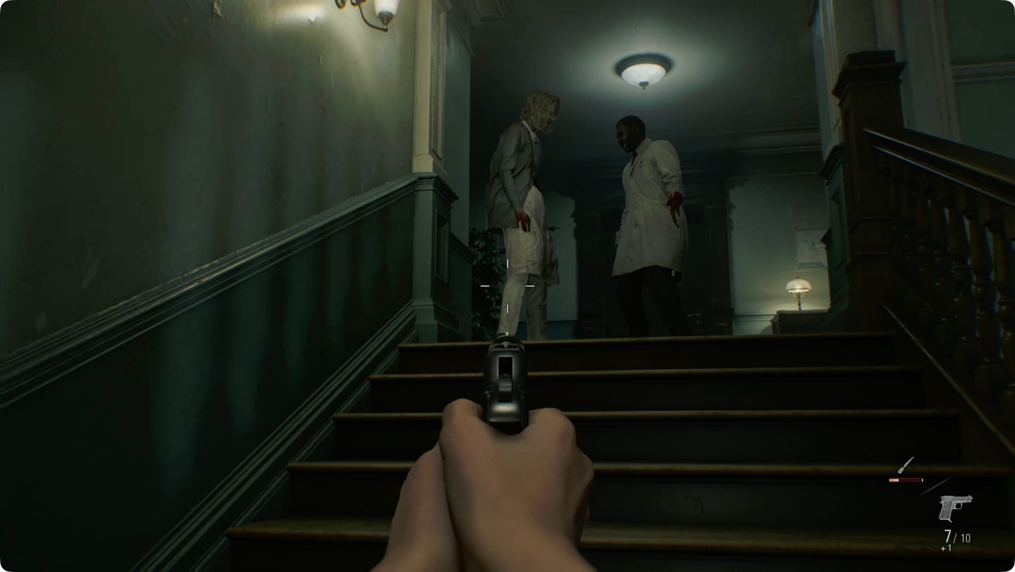 When you’re ready, head upstairs. There’s no trick here, you just have to shoot the pair of zombies at the top. Suck up any blood you can and make another Hemolytic Injector if you have space for one.