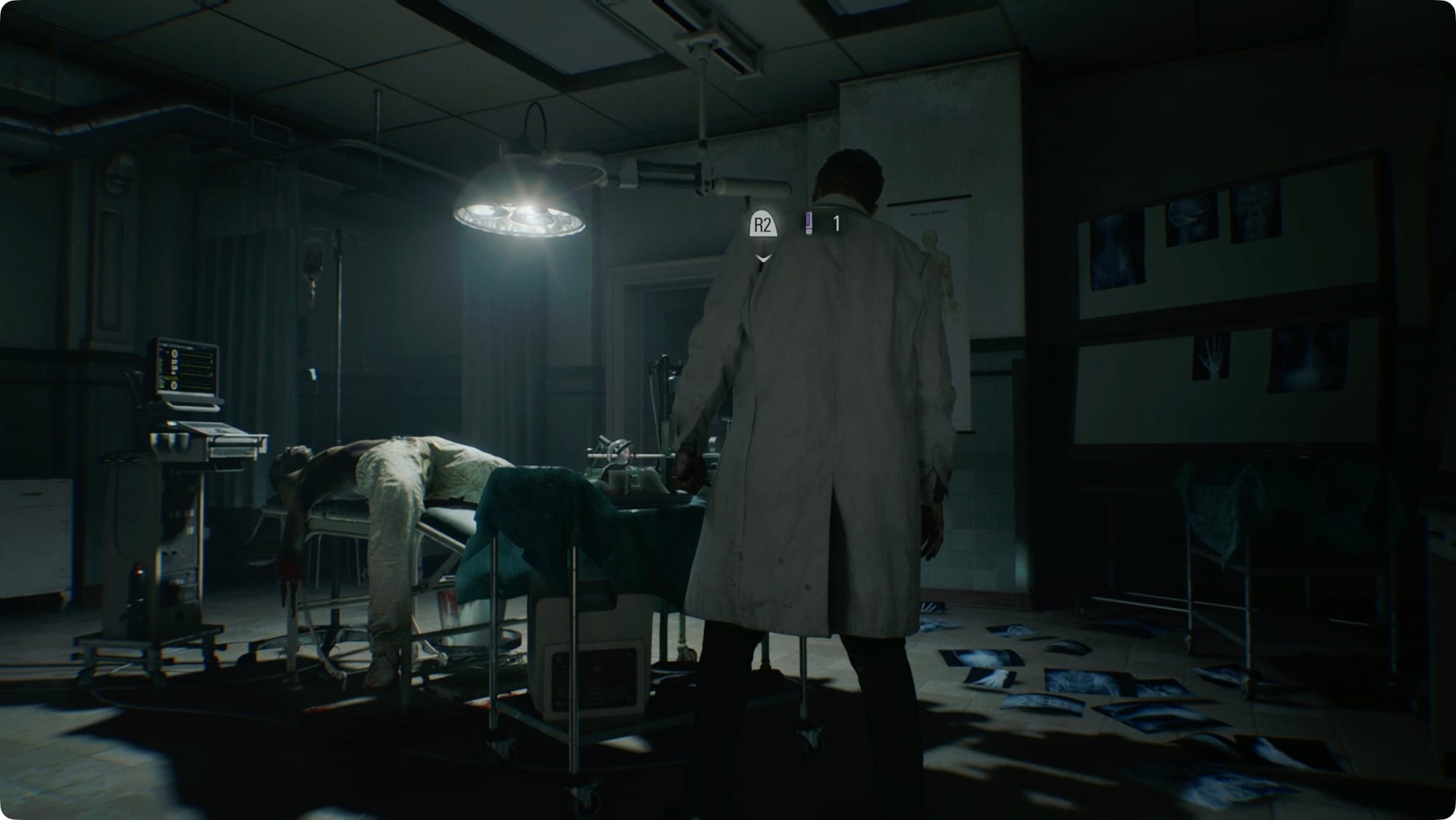 You need to grab a super useful item before the zombies in the room to the left notice you, so crouch down. Loop around the exam table going around the right side to find a safe we can’t open. Keep going until you spot the Hemolytic Injector on the counter. Grab it.