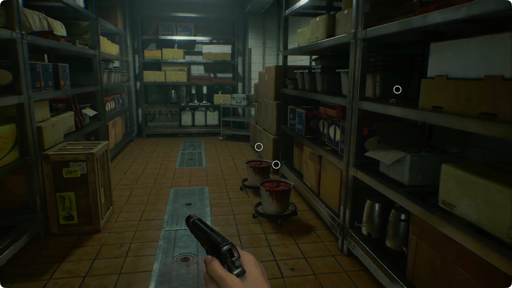 Keep going to the Kitchen and unlock the Pantry. Grab the Scrap and collect both buckets of blood to make another Hemolytic Injector. Smash the crate for some Handgun Ammo. Open the box at the back for one 12.7x55m round for Requiem (and reload it to free up the inventory slot). There’s also a Stakeout Takeout Charm there.