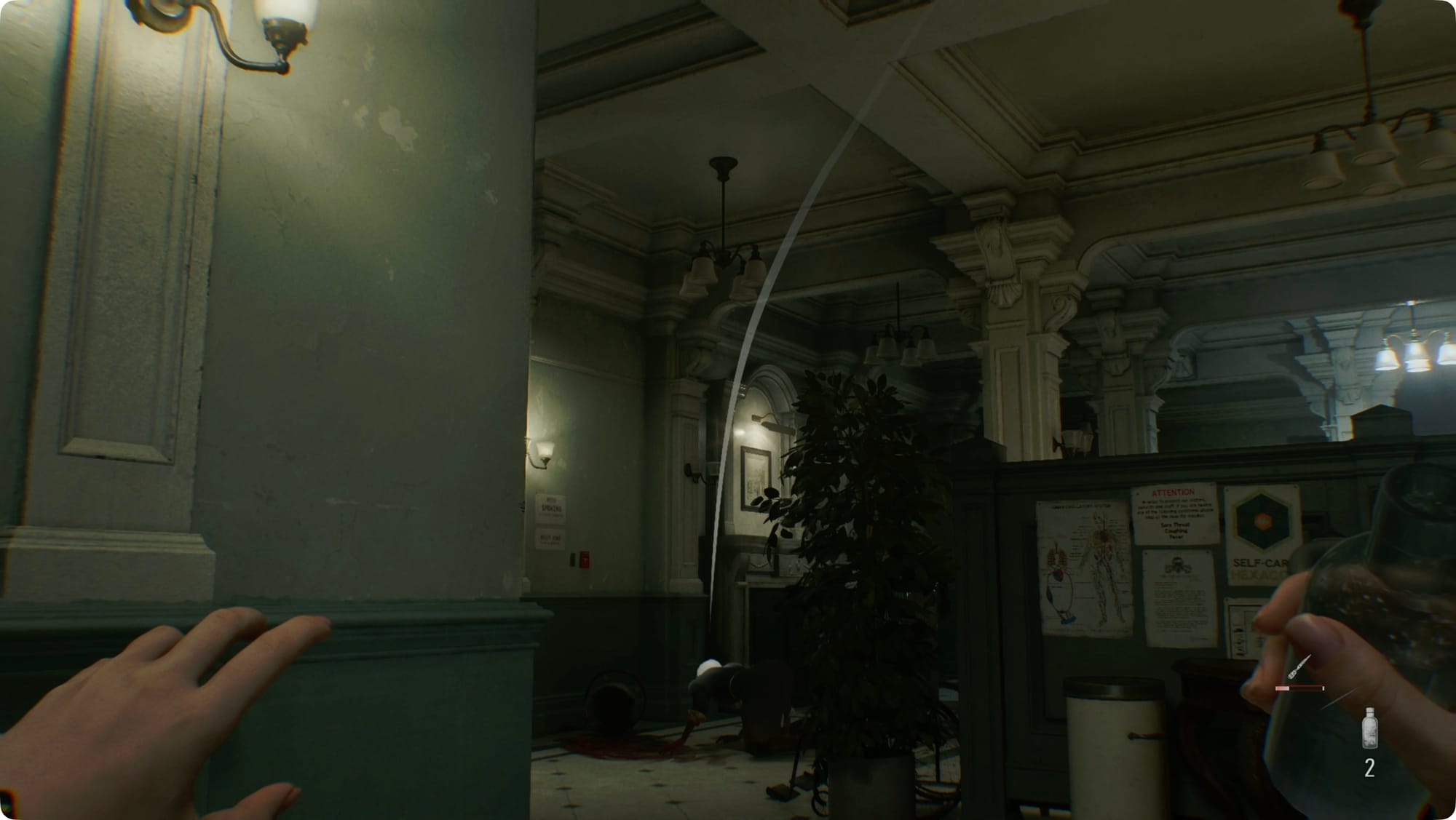 When you’re ready, head upstairs. There’s no trick here, you just have to shoot the pair of zombies at the top. Suck up any blood you can and make another Hemolytic Injector if you have space for one.