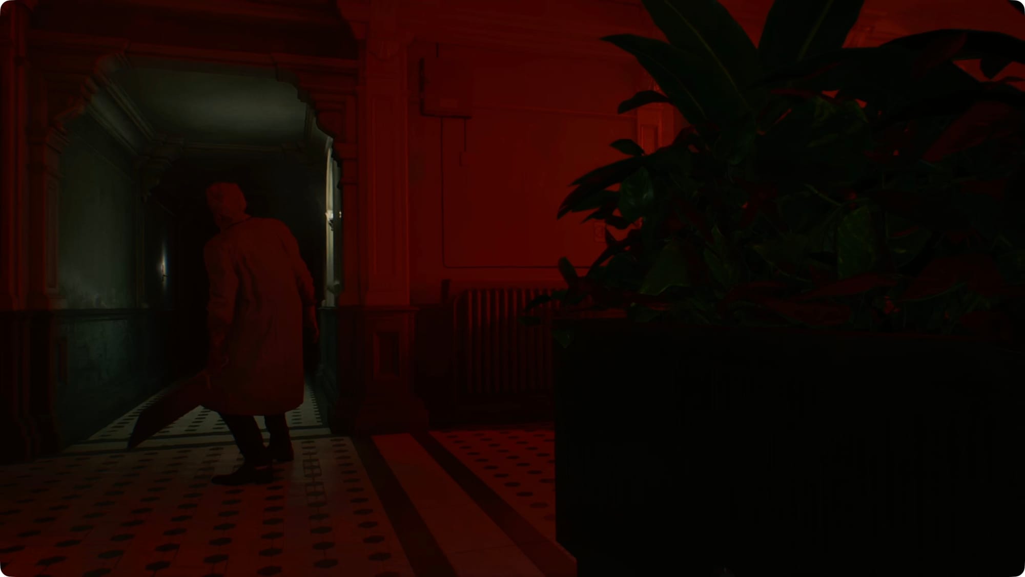 Unlock the door ahead of you to unblock a path from earlier. Don’t go through the door yet, though. The singer from the Bar is wandering the hall and we don’t need to deal with her right now. Wait for her to pass by heading right and then go take a left.