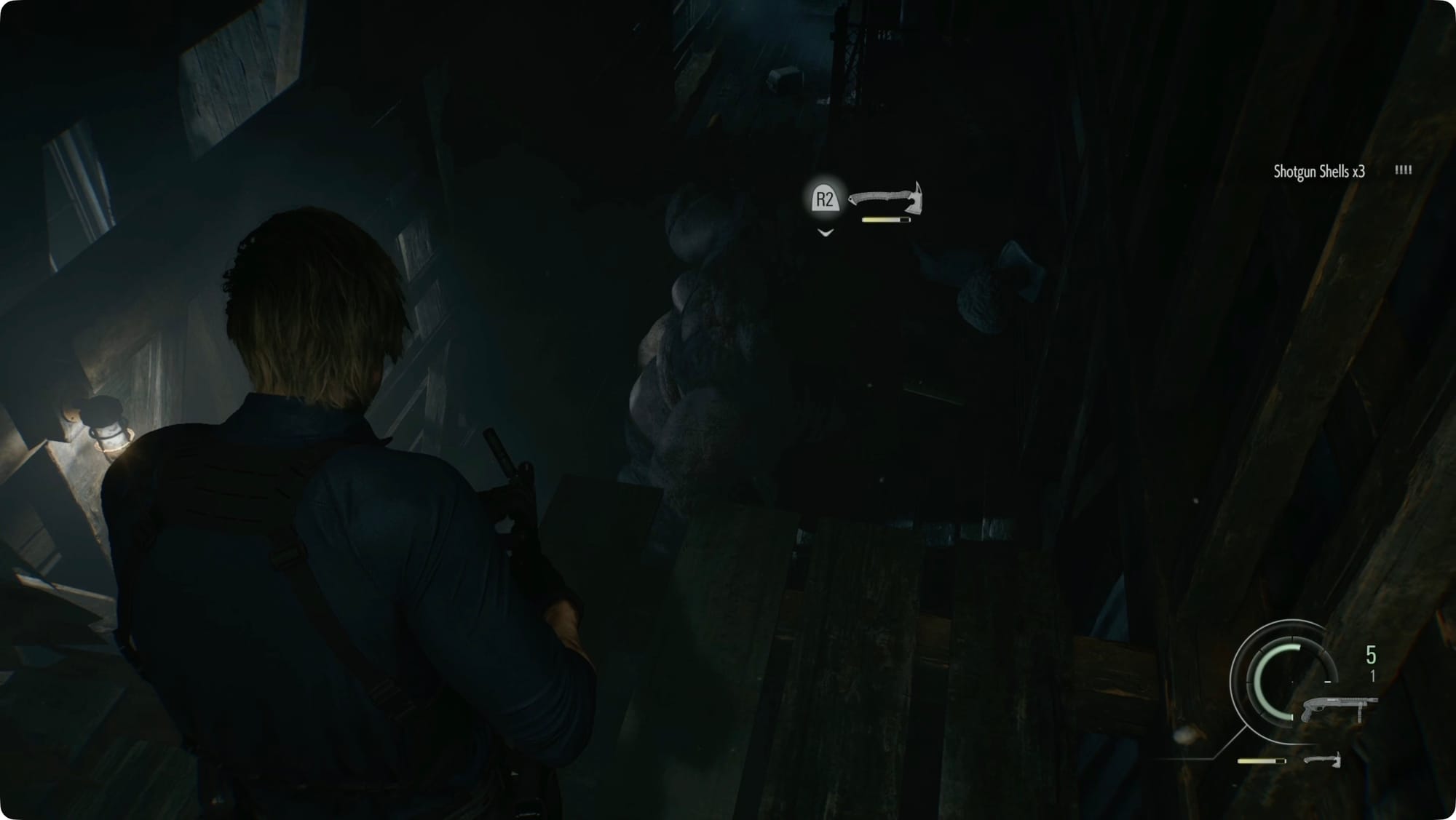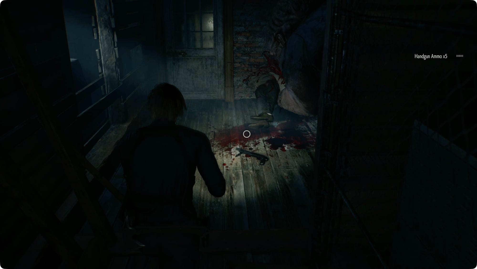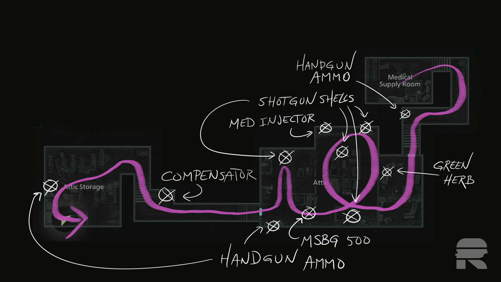 In the Attic proper, your map will show some Shotgun Shells, but you can’t get them yet. Take a right and loop around the room to grab some more Handgun Ammo.