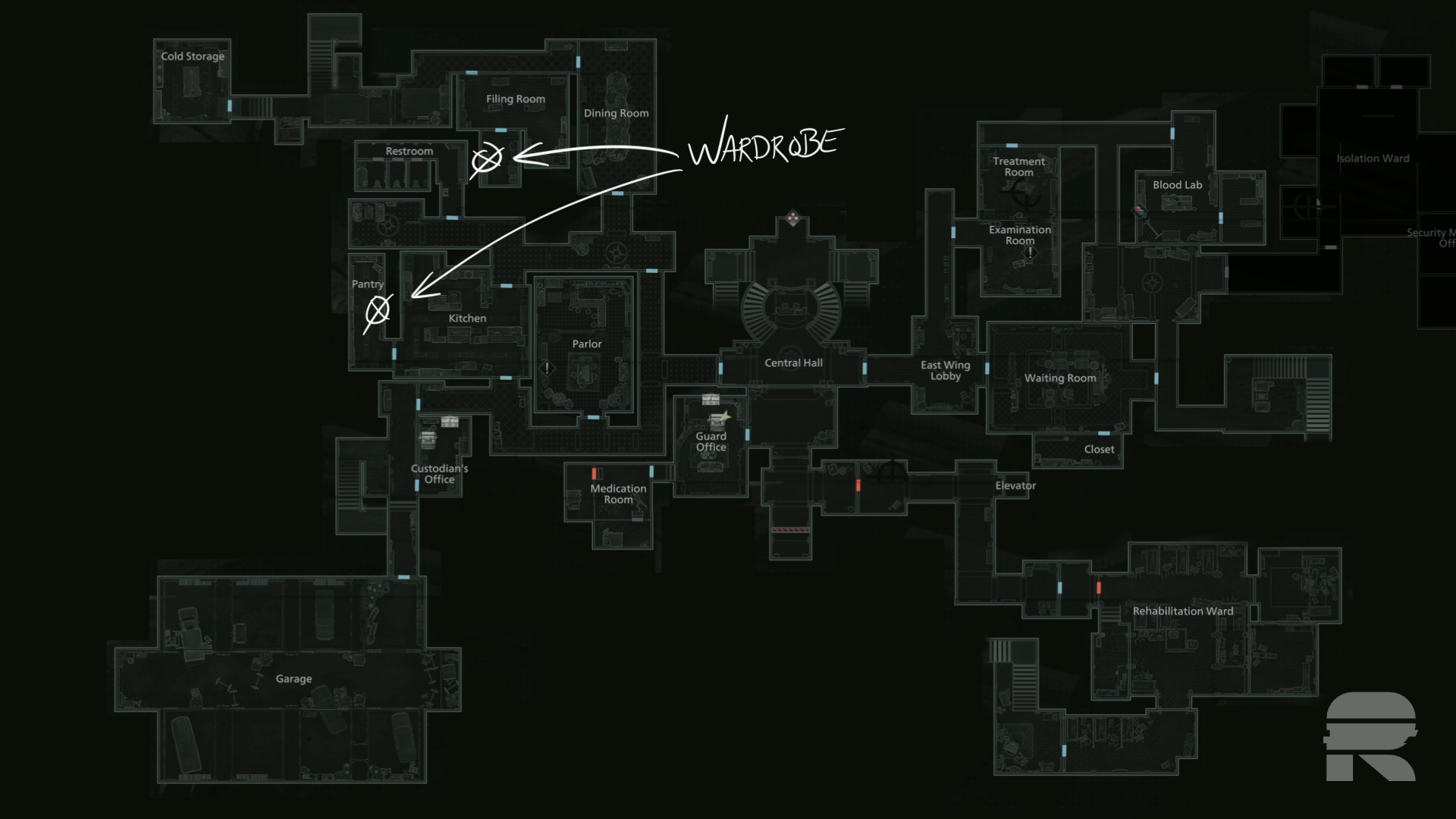Head back through the Dining Room, into the Kitchen, and back into the Pantry. This wardrobe has a Connoisseur Charm (this one is worth attaching to your handgun).