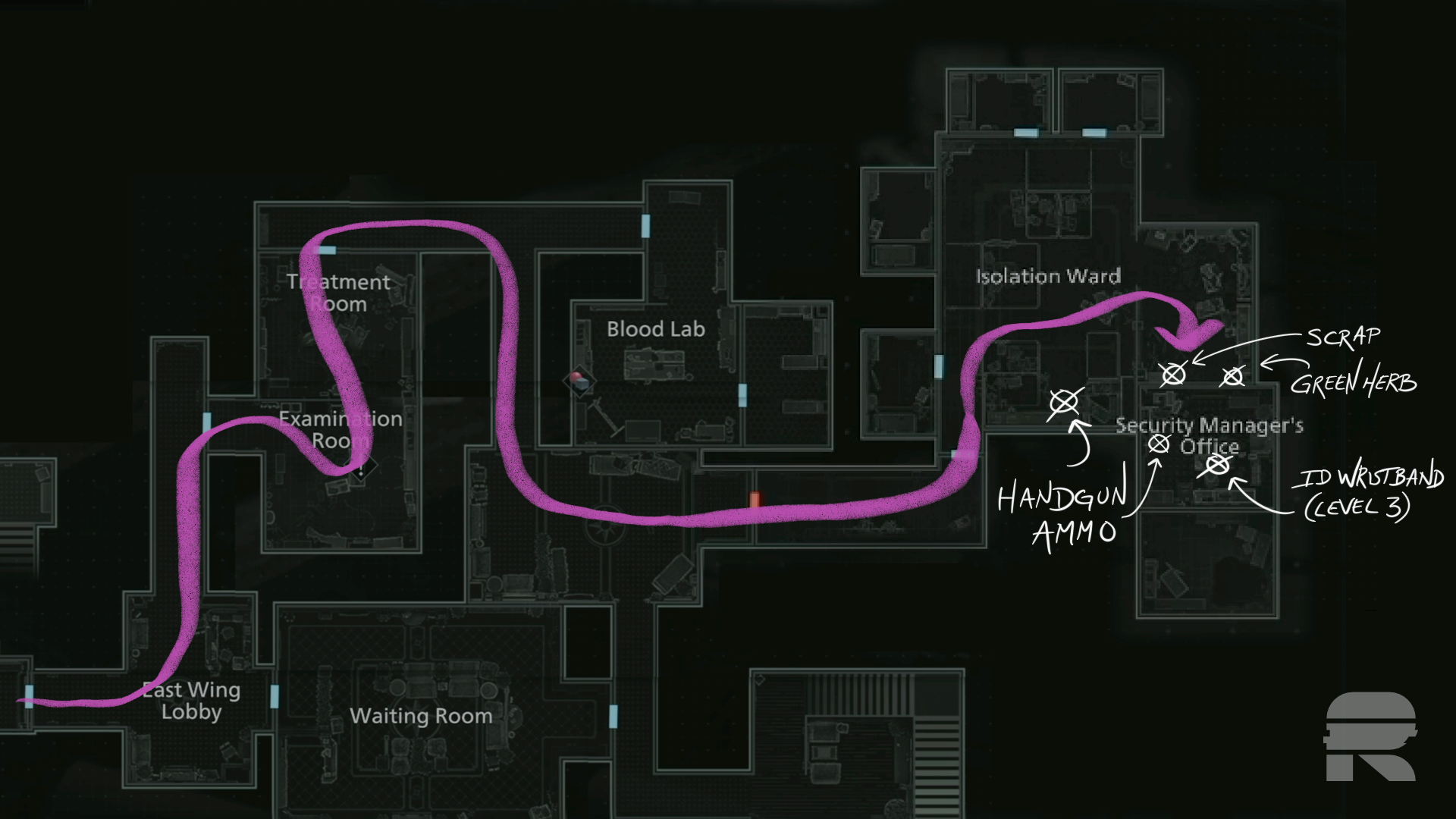 Read the Double Mutation and Nurse’s Log files, and grab the Green Herb over to the right. There’s some Scrap to the right of the door. If you can, it’s probably worth it to whip up a Hemolytic Injector for whatever’s coming.