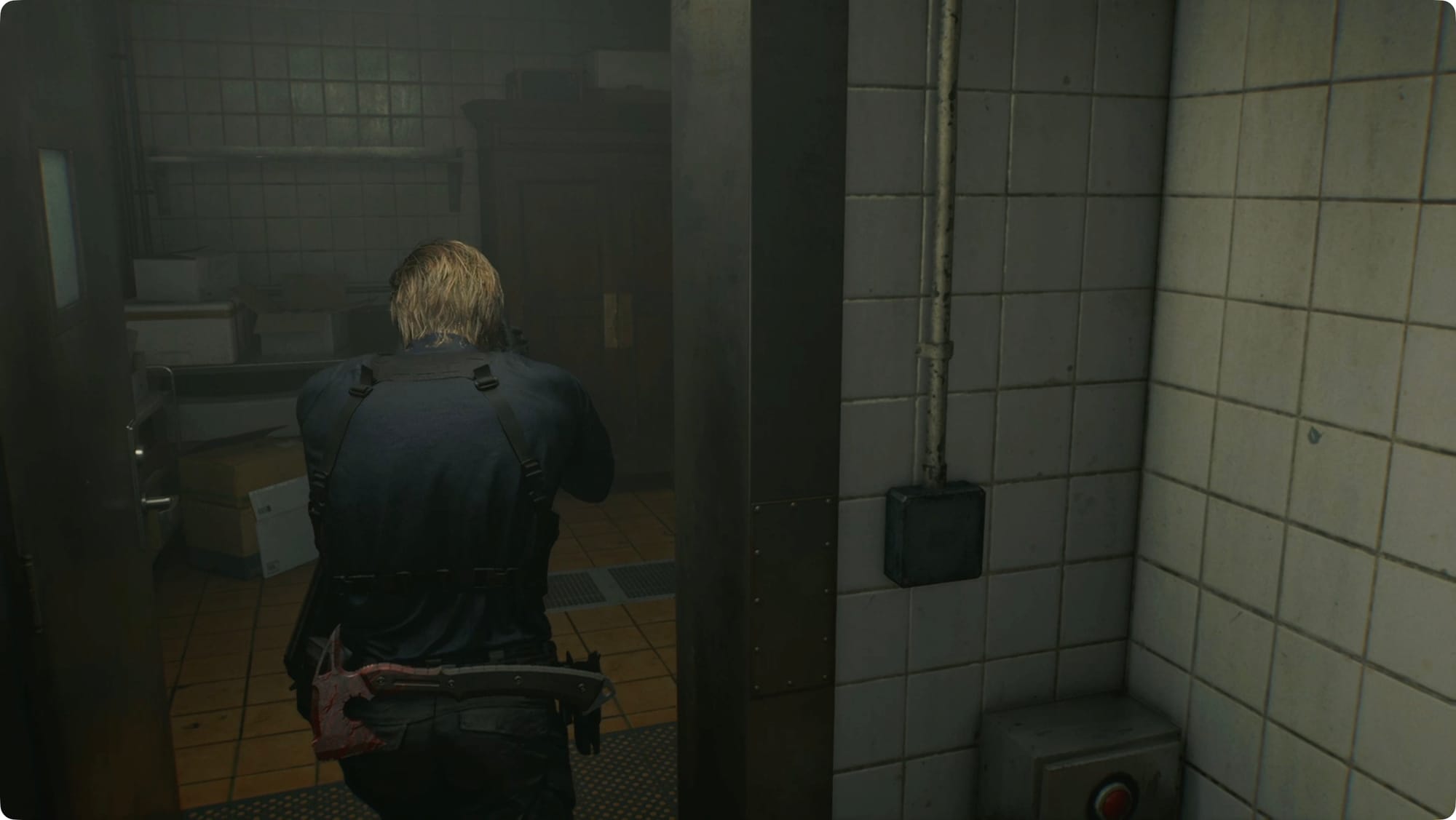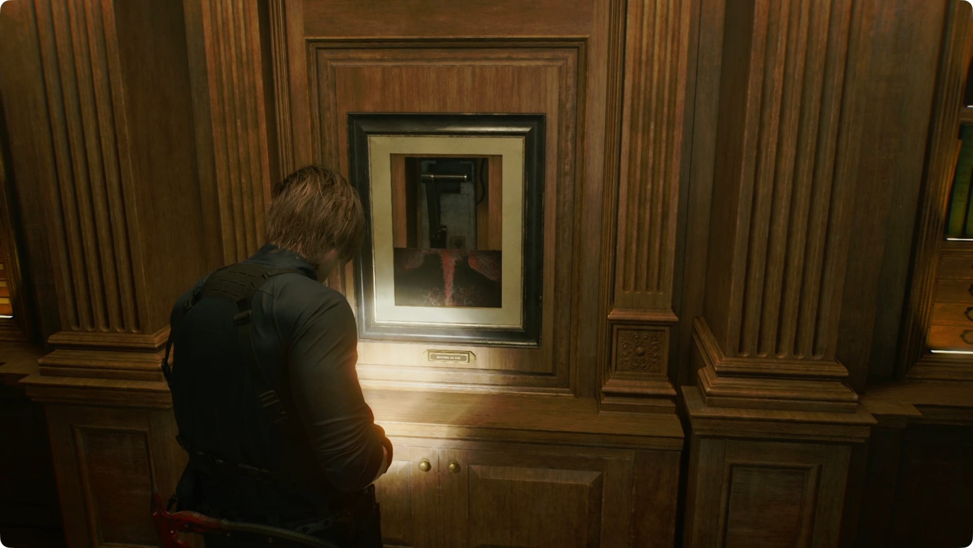 There’s a safe behind the bar that we already know the combination to (it’s on a desk in the Office) — L10, R80, L30 — but Leon can’t (or won’t) open it.