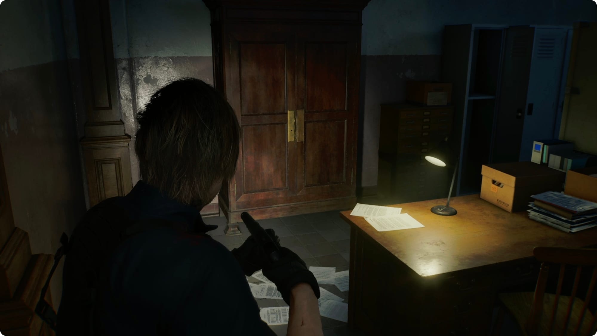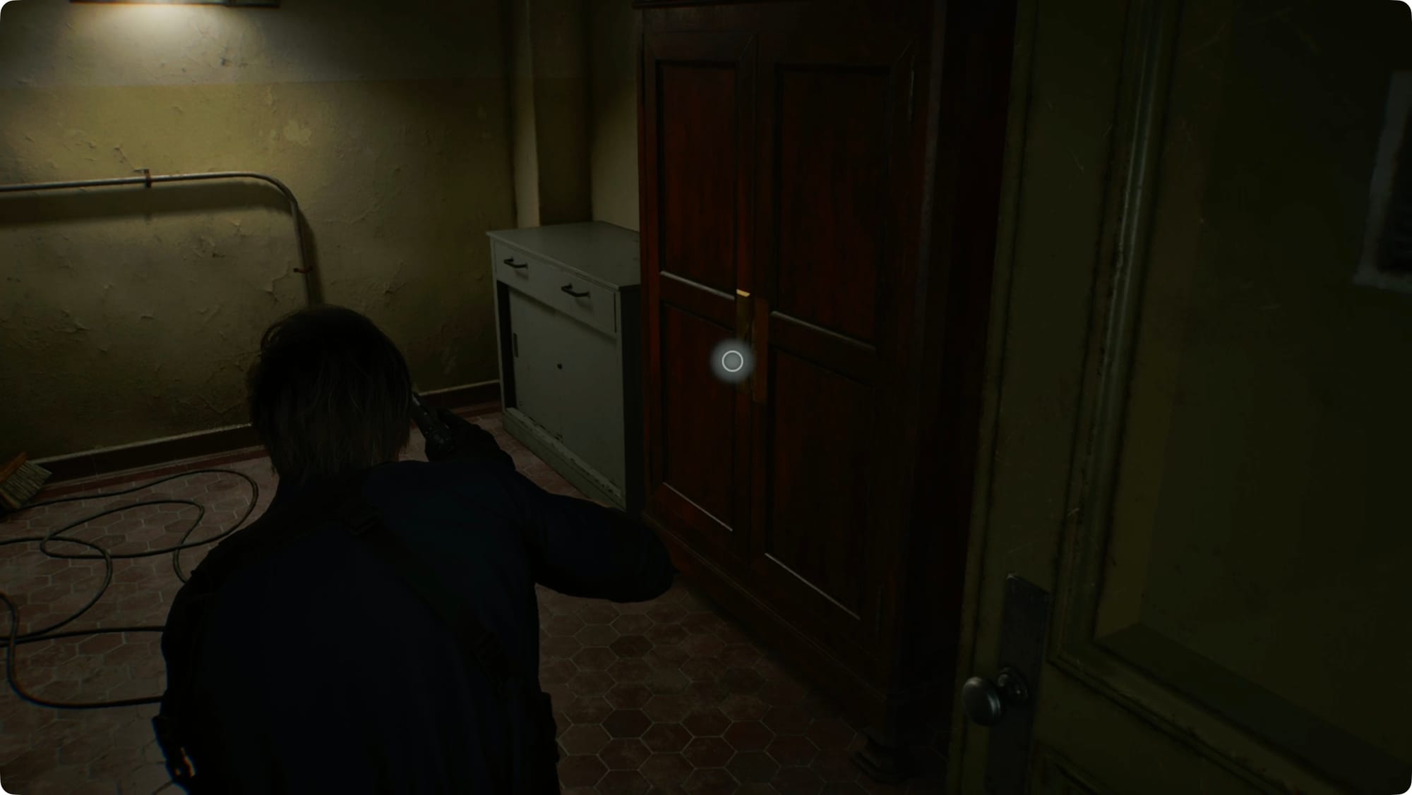 The next wardrobe is in the room attached to the Filing Room. Inside is a Med Injector and some Handgun Ammo.