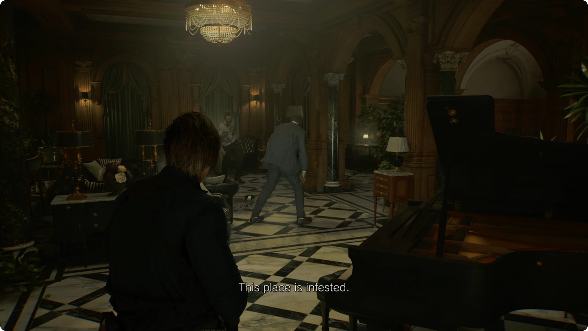 Take a right and handle the trio of zombies in the Bar & Lounge. The singer will drop an Antique Coin, but Leon can’t pick it up. There’s a Green Herb on the far side.