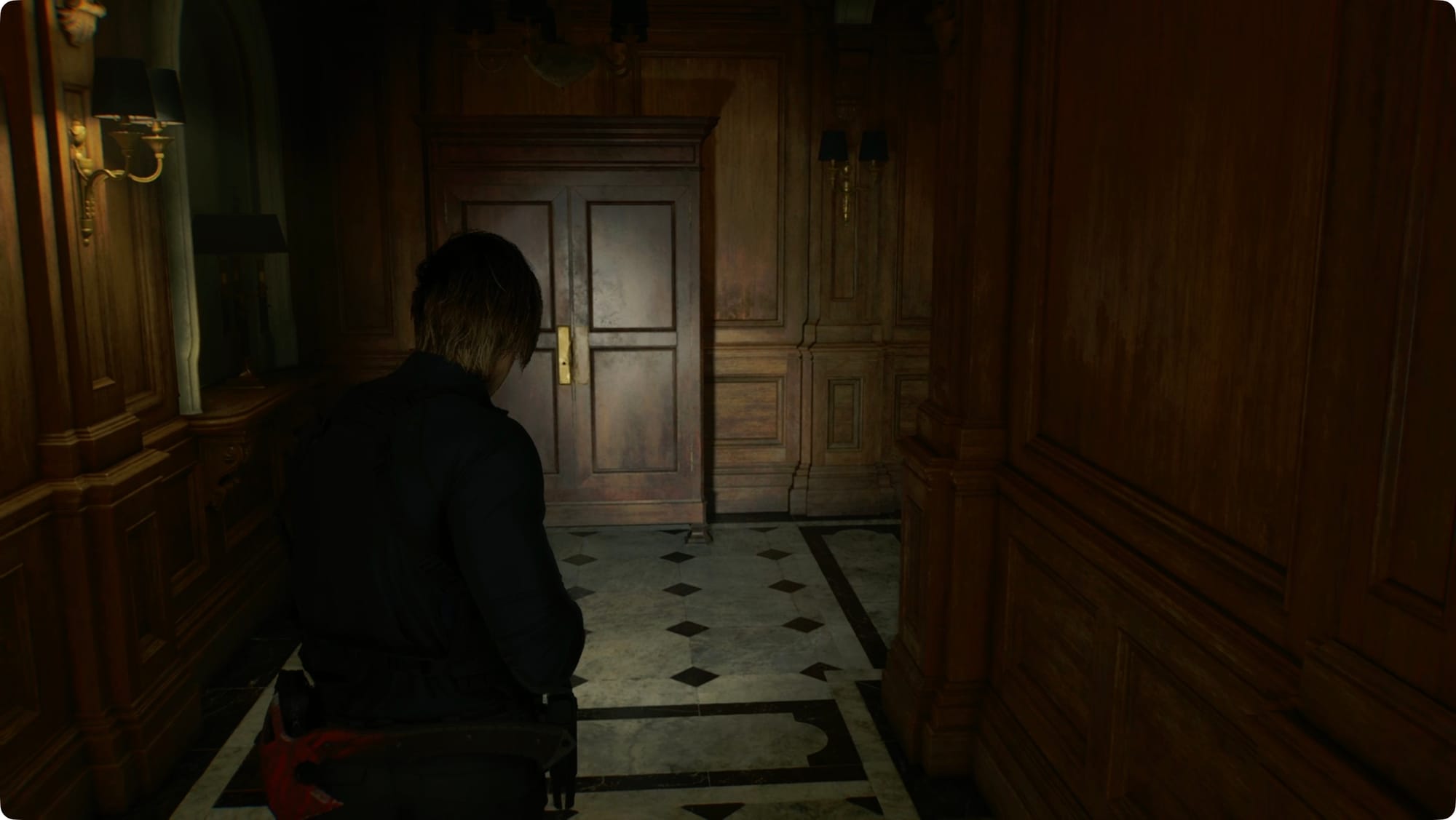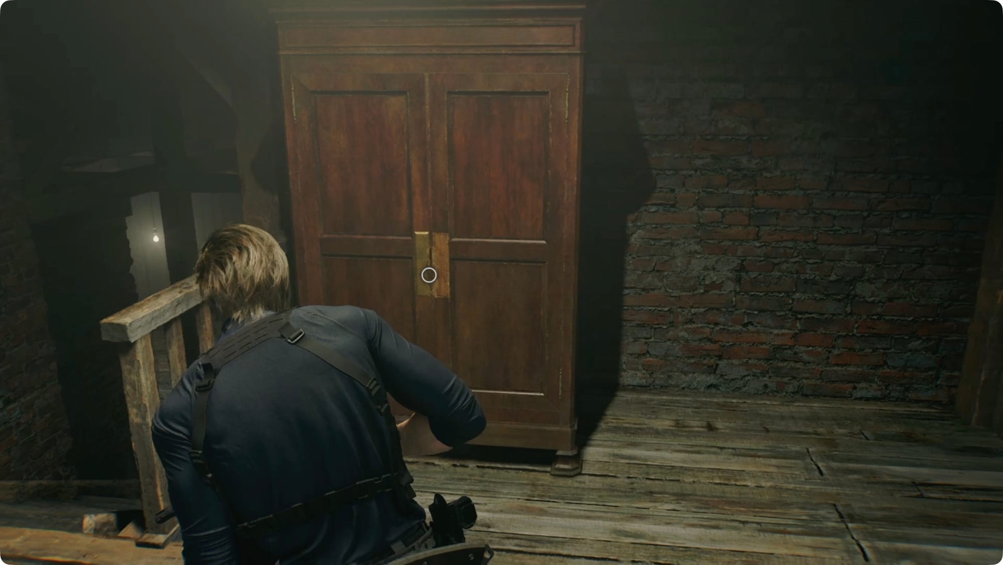You’ll come to one of those warped-shut wardrobes, but Leon can open them with his axe! Inside this one is a Basement Safe Code file and a Compensator. Open your inventory to attach it to your Alligator Snapper(?) handgun.