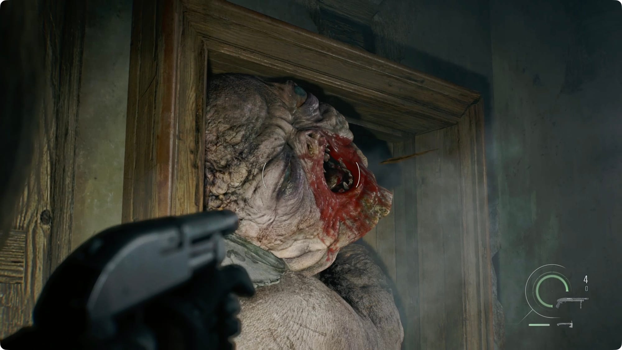 Backtrack off to the right and you’ll pass through a door he can’t (where you picked up the Handgun Ammo). While he’s stuck, pump three shotgun rounds into his face and follow it up with an axe attack when he’s stunned.
