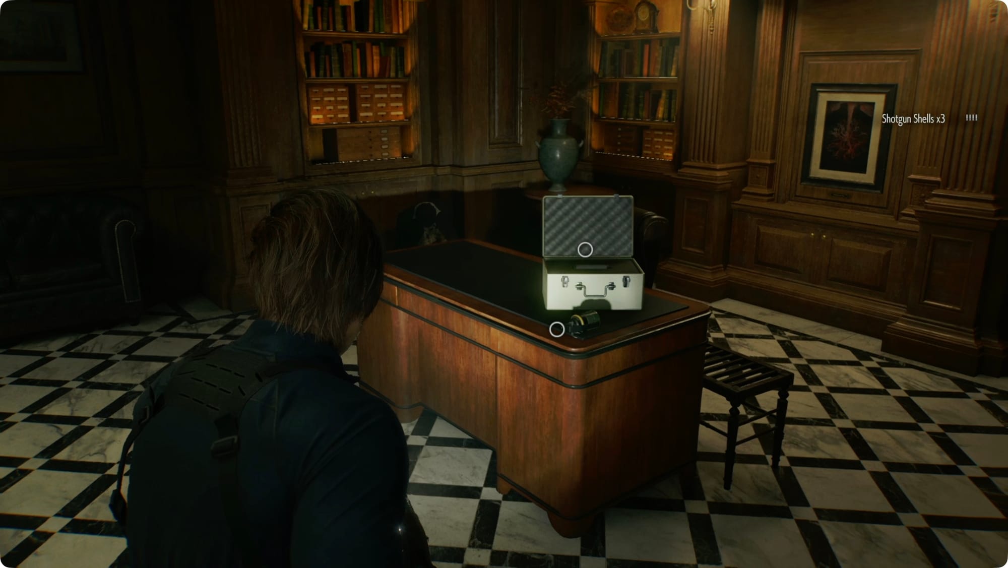 Before you go through the door on the far side of the room from where you entered, there’s some Handgun Ammo to the left in the window, and, if you take a right, you’ll find three more boxes of Shotgun Shells.