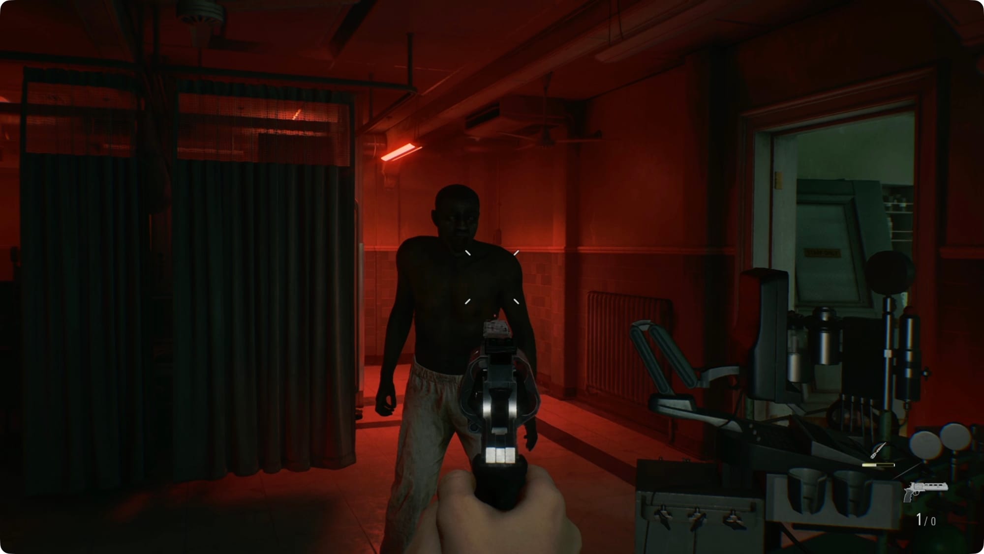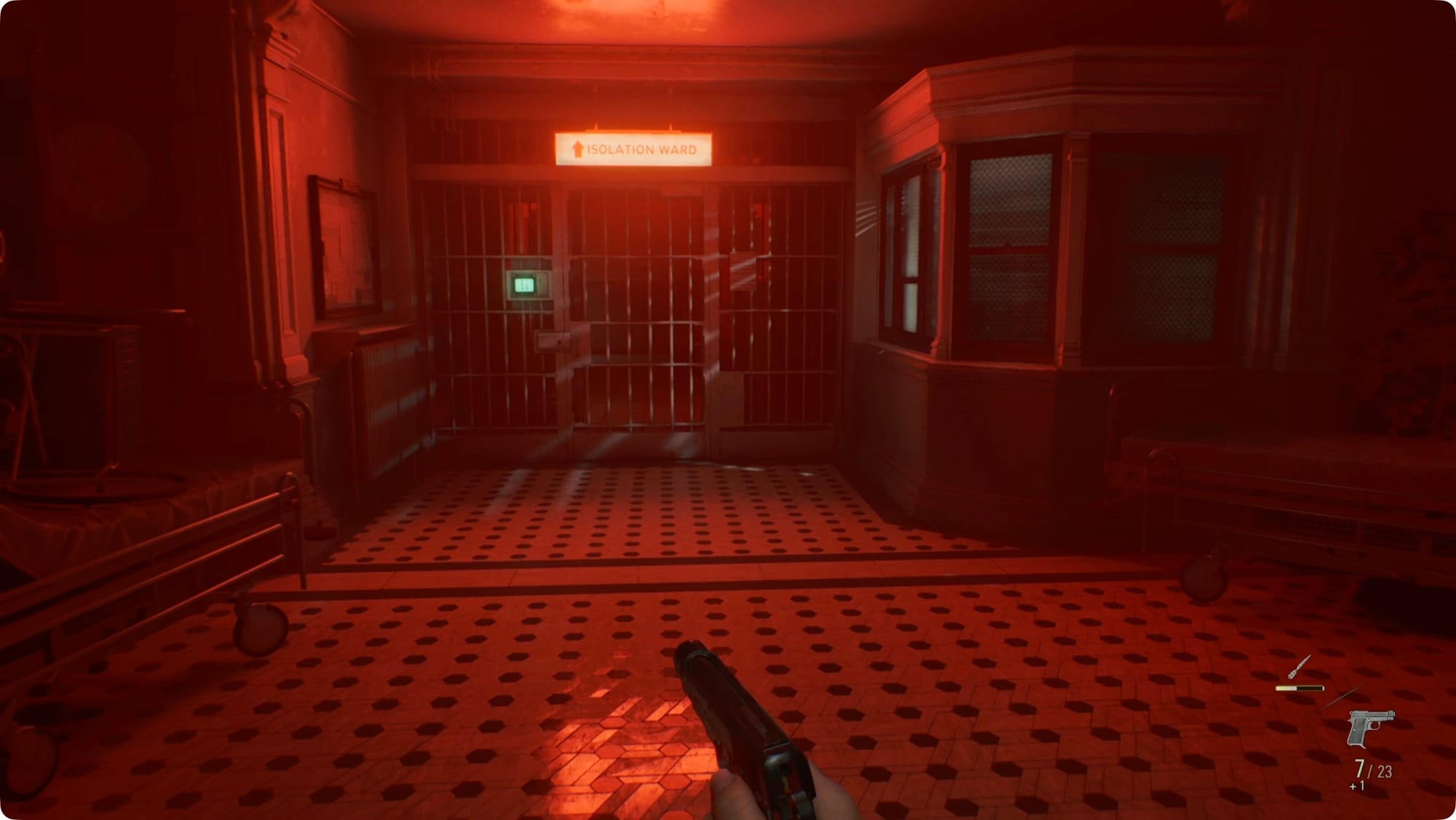 Take the right and into the ward itself. Just inside, there’s a bucket of blood to the left and a Handgun Ammo crate in the back right. Head into the room off of the east end of the ward.