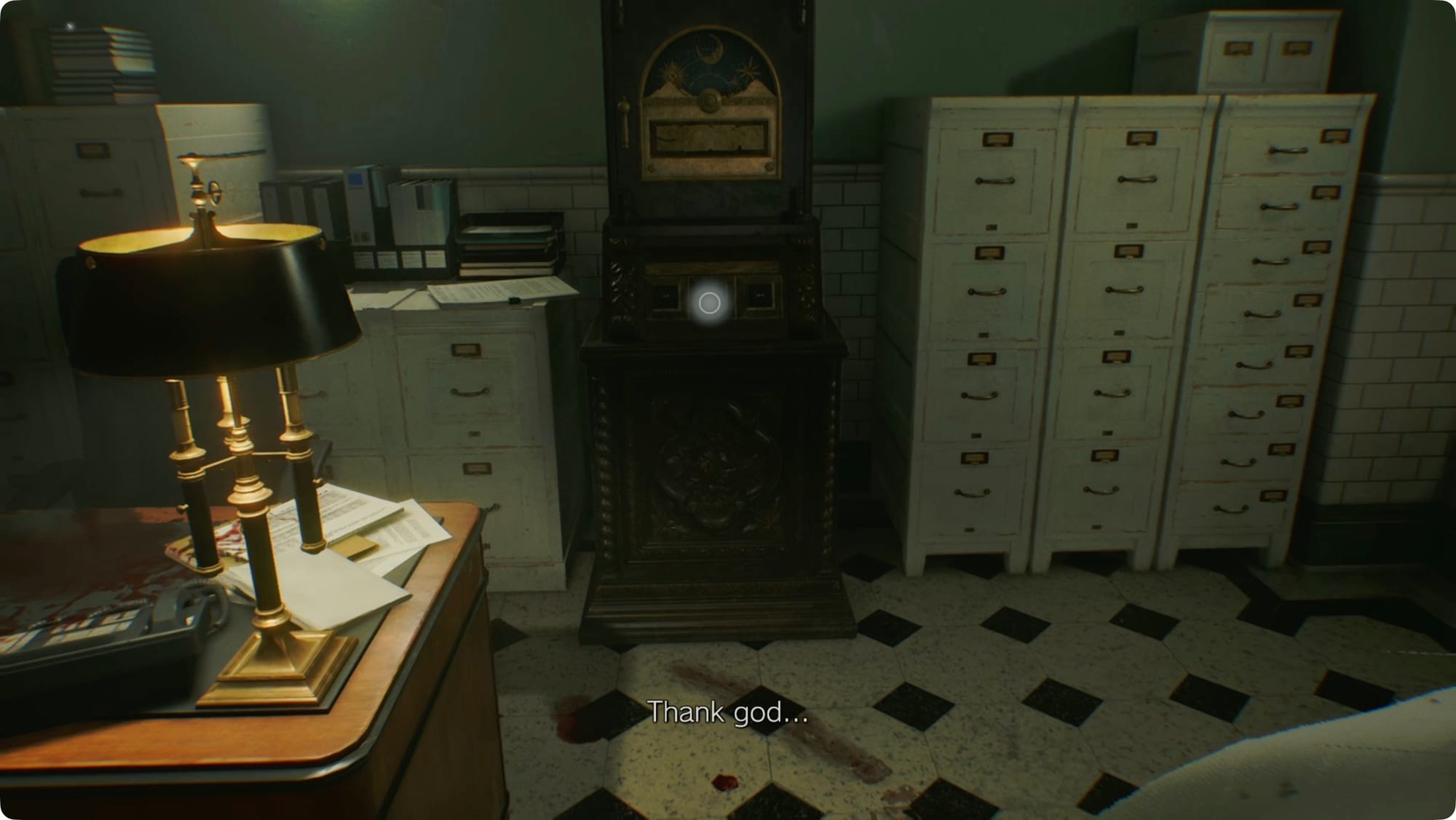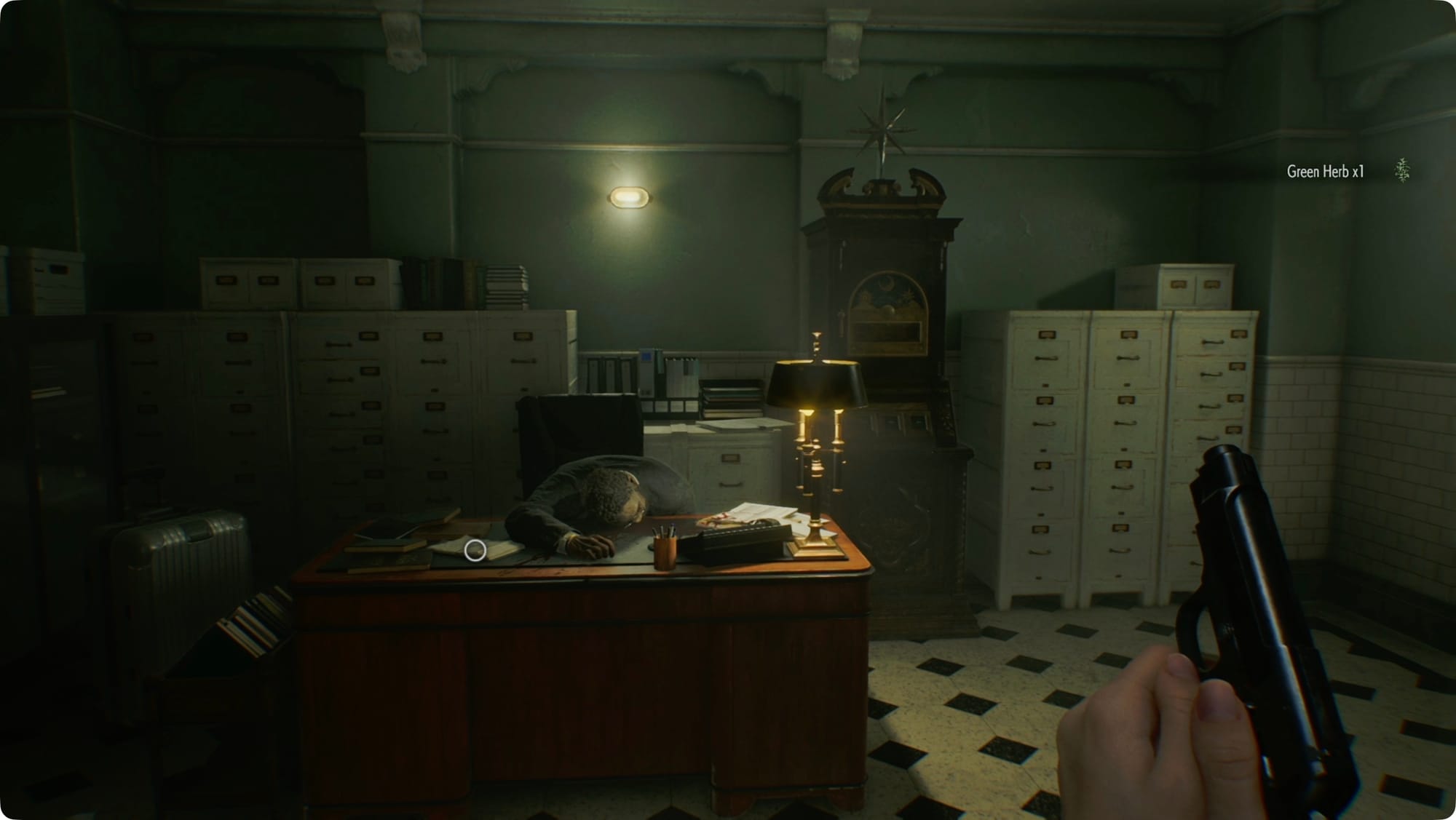 After your lovely conversation with Victor, you’ll only have one path forward. At the end of the first hall, smash the crate for some Handgun Ammo. In the next room, you’ll find a Green Herb. Before you duck under the toppled cabinet, turn left for the Satiety Suppression Medical Records.